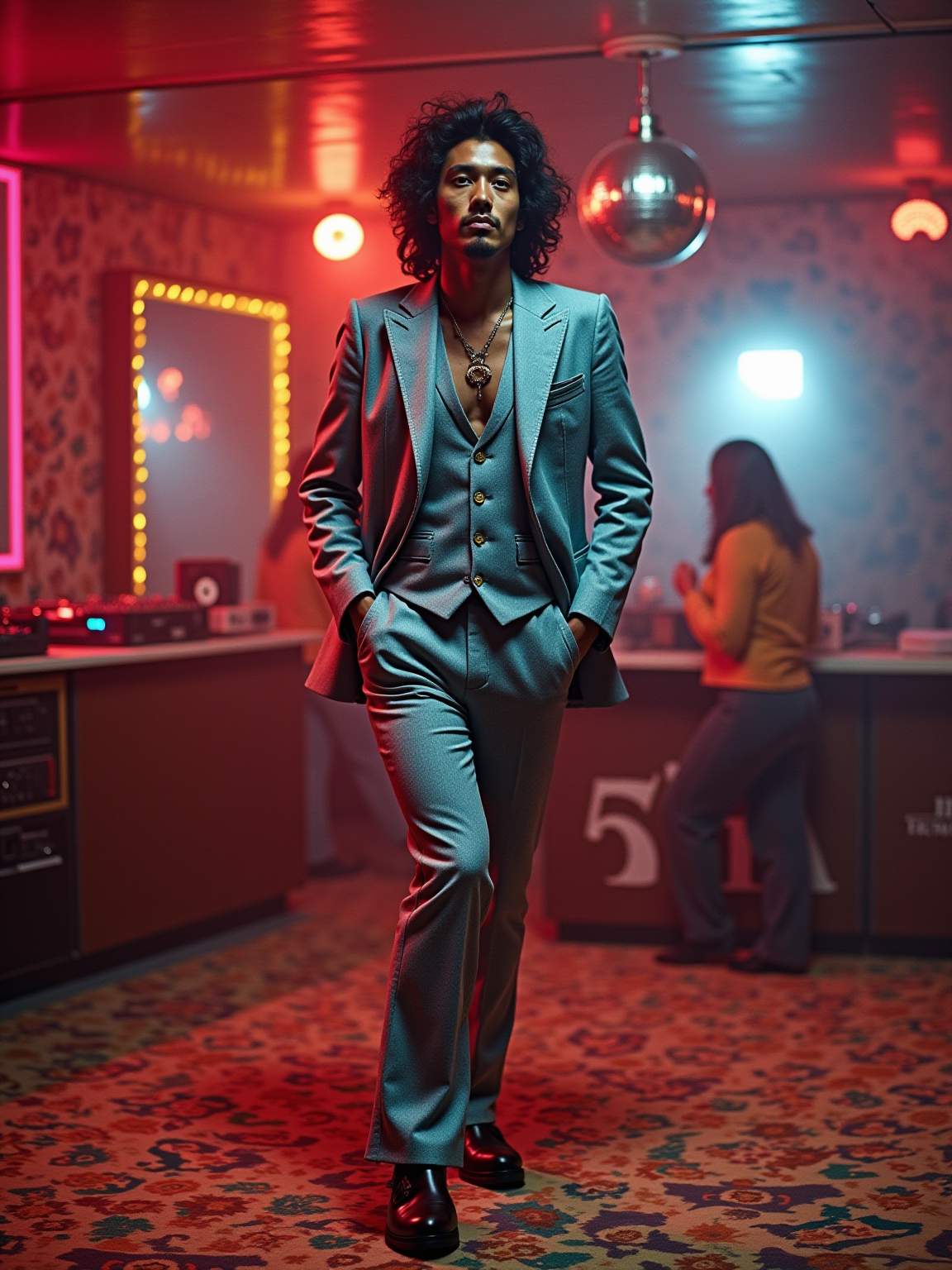 model in a typical 70s disco, wearing a three-piece suit with wide lapels and platform shoes, dancing under a spinning disco ball, neon lights reflecting off mirrored walls, vinyl records scattered around DJ booth, psychedelic carpet with wild patterns