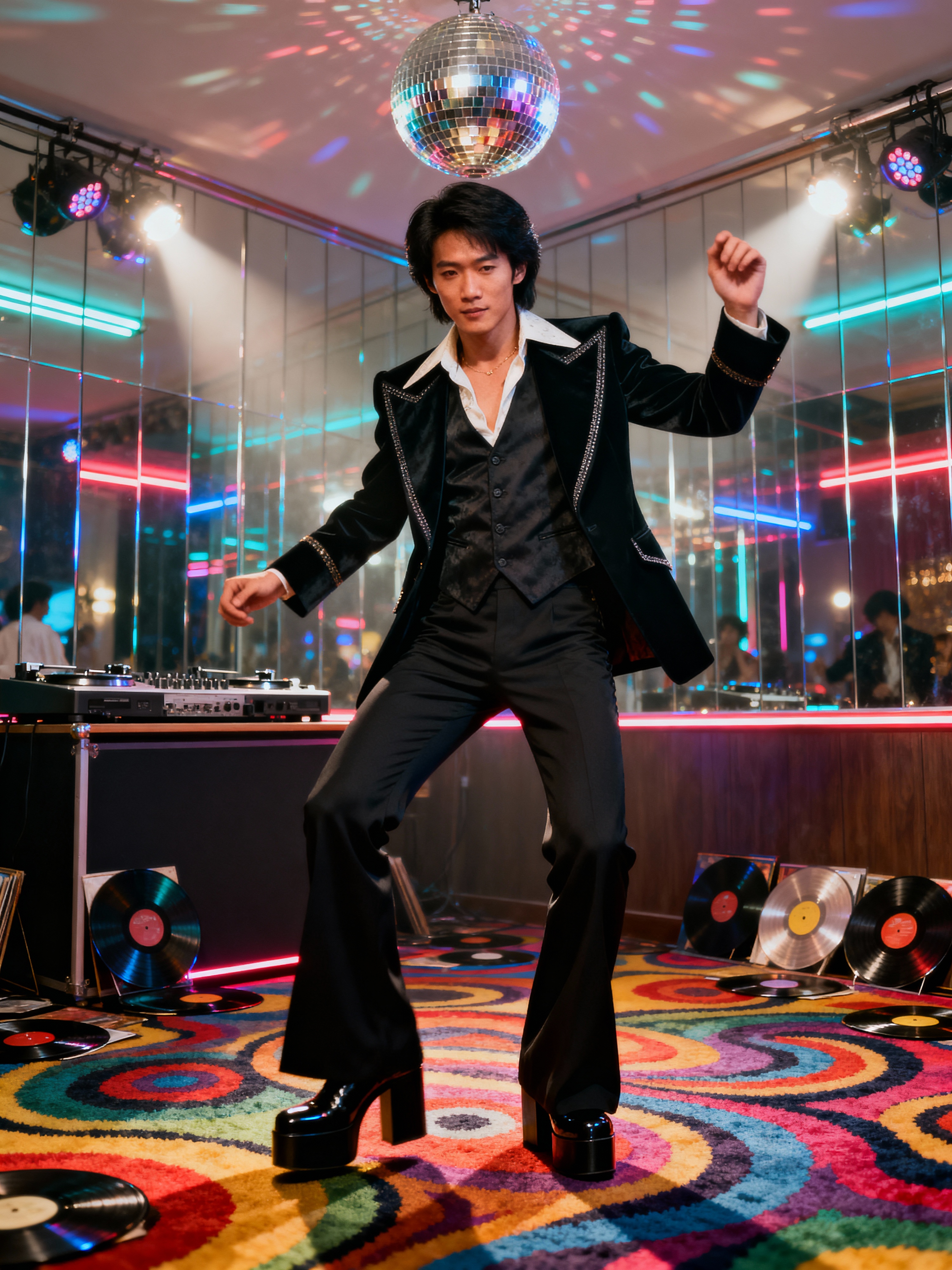model in a typical 70s disco, wearing a three-piece suit with wide lapels and platform shoes, dancing under a spinning disco ball, neon lights reflecting off mirrored walls, vinyl records scattered around DJ booth, psychedelic carpet with wild patterns