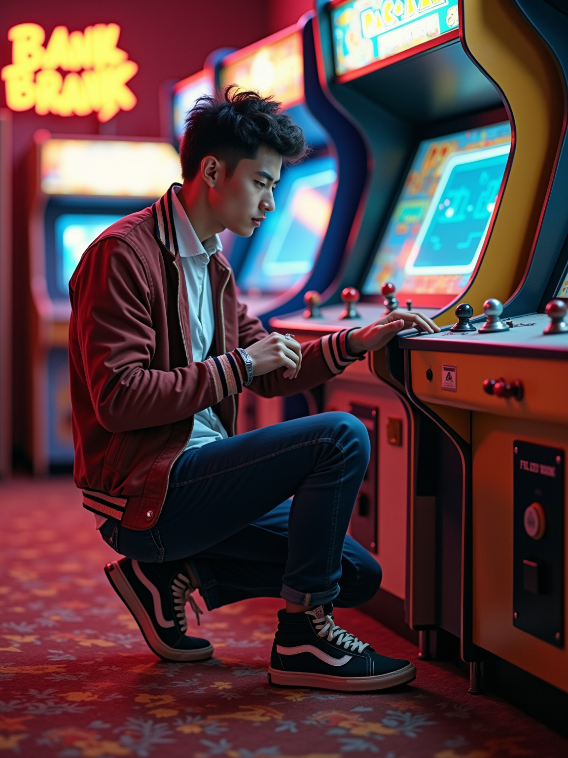 model in a typical 80s arcade, wearing varsity jacket and high-top sneakers, playing Pac-model or Donkey Kong, neon lights reflecting off arcade cabinets, quarters scattered on machine, retro carpet with wild patterns