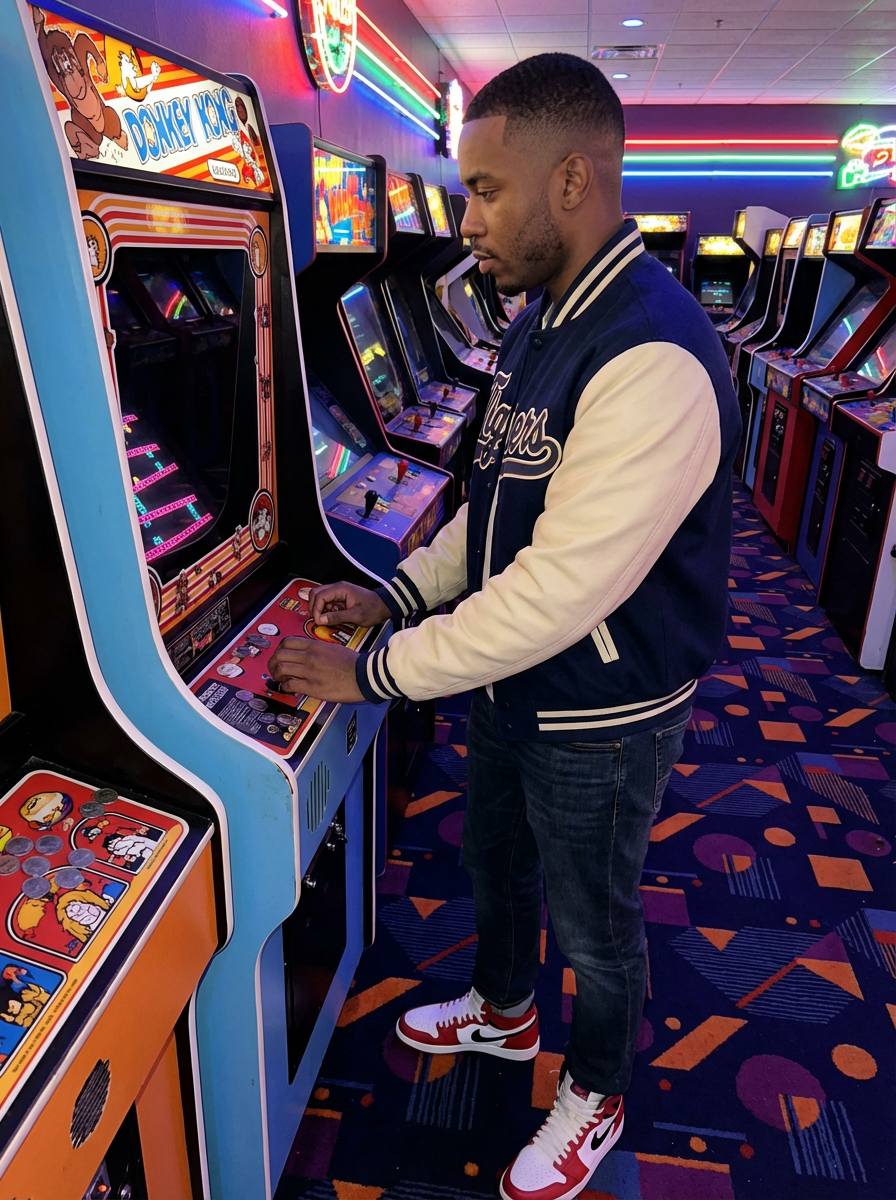 model in a typical 80s arcade, wearing varsity jacket and high-top sneakers, playing Pac-model or Donkey Kong, neon lights reflecting off arcade cabinets, quarters scattered on machine, retro carpet with wild patterns
