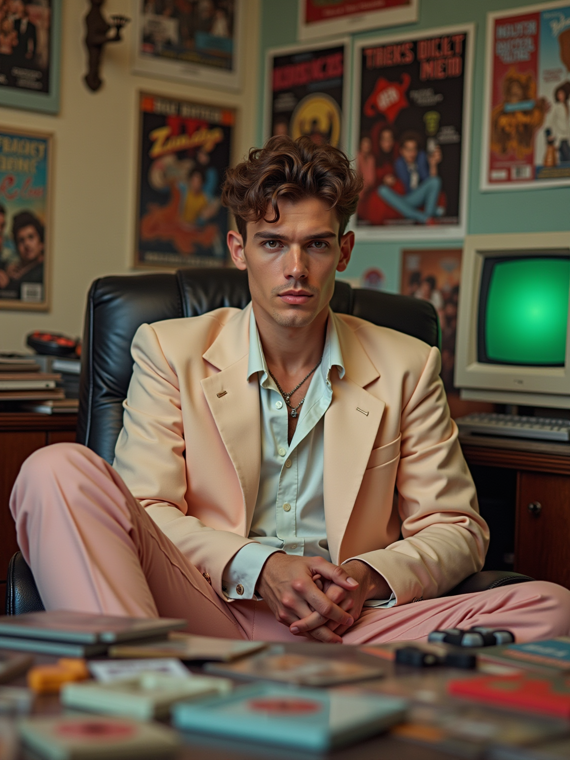 model in a typical 80s bedroom, wearing a Miami Vice style pastel suit jacket with rolled sleeves, surrounded by scattered cassette tapes and vinyl records, posters of 80s bands and movies on the walls, retro computer with green monochrome monitor in background