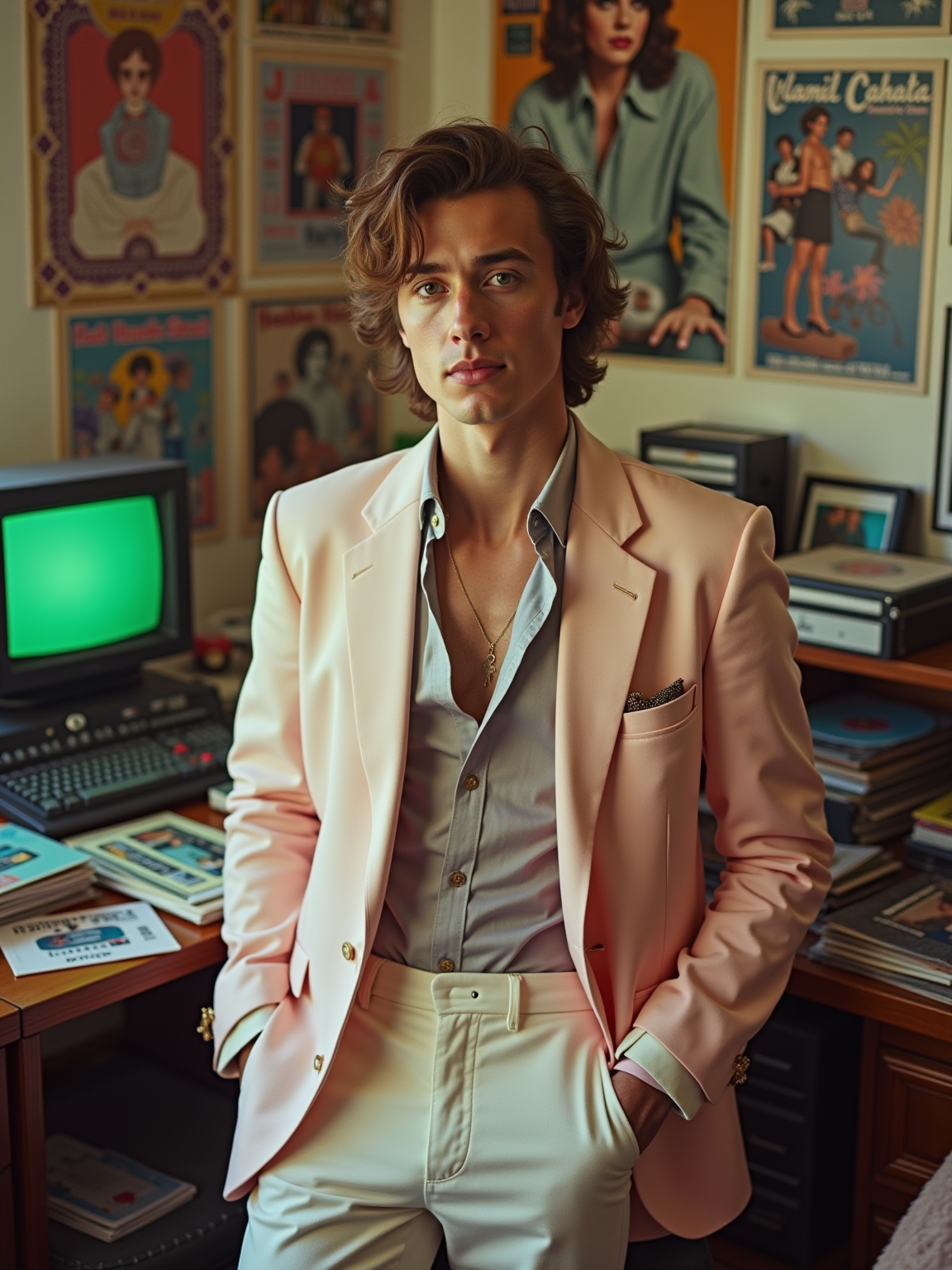 model in a typical 80s bedroom, wearing a Miami Vice style pastel suit jacket with rolled sleeves, surrounded by scattered cassette tapes and vinyl records, posters of 80s bands and movies on the walls, retro computer with green monochrome monitor in background