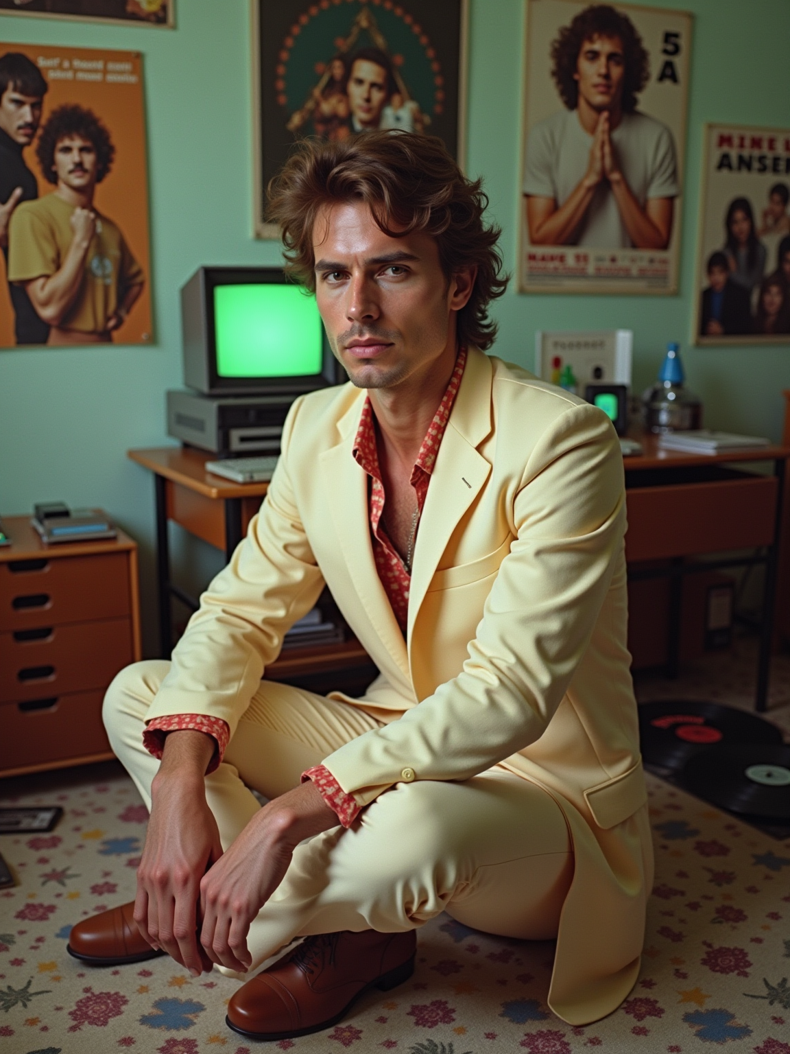 model in a typical 80s bedroom, wearing a Miami Vice style pastel suit jacket with rolled sleeves, surrounded by scattered cassette tapes and vinyl records, posters of 80s bands and movies on the walls, retro computer with green monochrome monitor in background