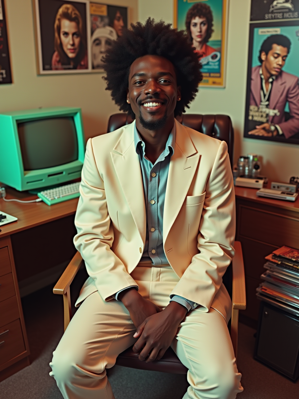 model in a typical 80s bedroom, wearing a Miami Vice style pastel suit jacket with rolled sleeves, surrounded by scattered cassette tapes and vinyl records, posters of 80s bands and movies on the walls, retro computer with green monochrome monitor in background