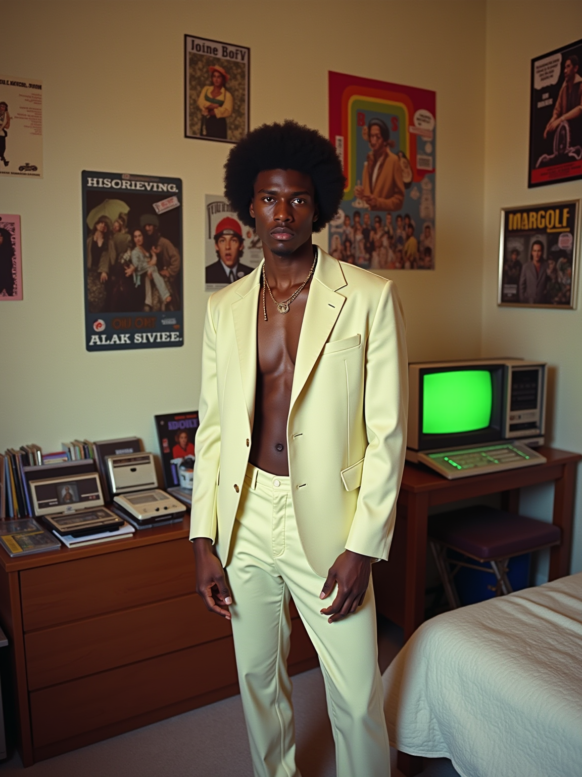 model in a typical 80s bedroom, wearing a Miami Vice style pastel suit jacket with rolled sleeves, surrounded by scattered cassette tapes and vinyl records, posters of 80s bands and movies on the walls, retro computer with green monochrome monitor in background