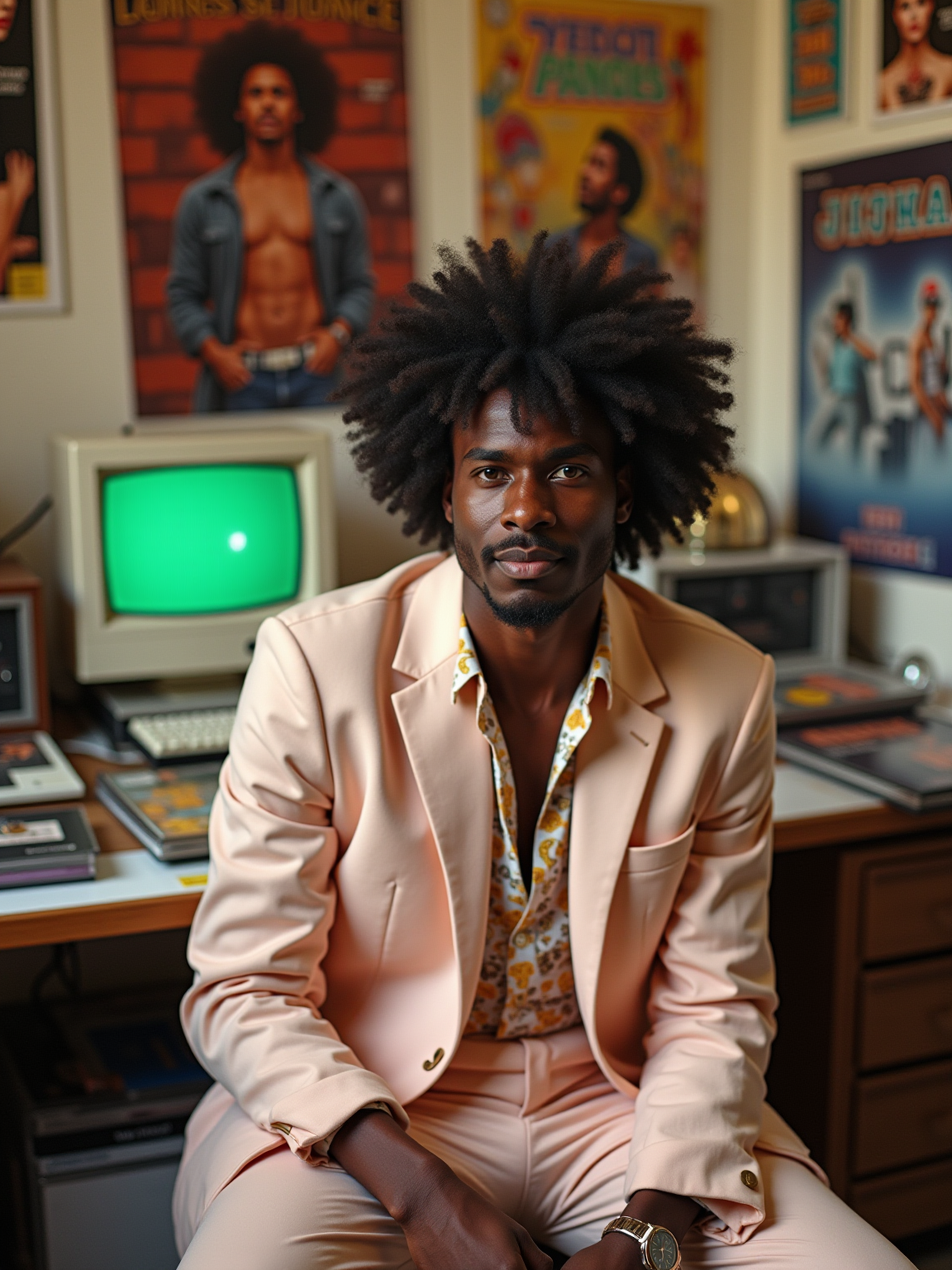 model in a typical 80s bedroom, wearing a Miami Vice style pastel suit jacket with rolled sleeves, surrounded by scattered cassette tapes and vinyl records, posters of 80s bands and movies on the walls, retro computer with green monochrome monitor in background