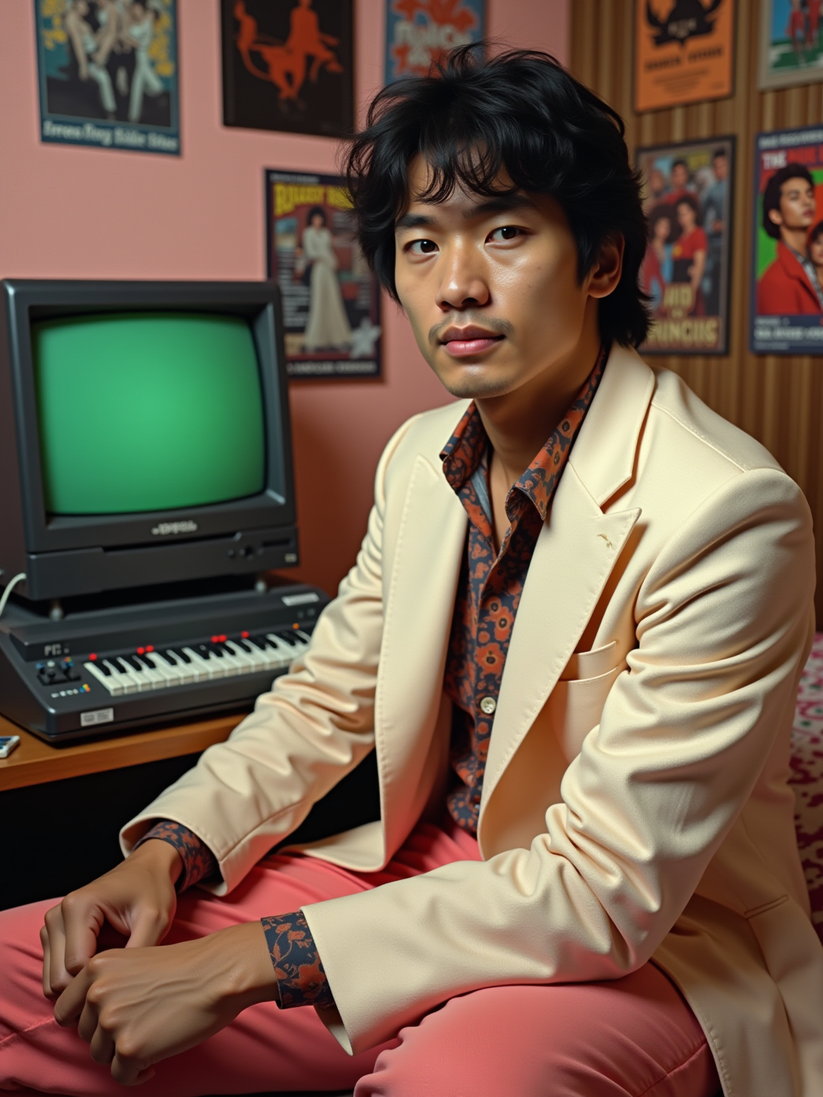 model in a typical 80s bedroom, wearing a Miami Vice style pastel suit jacket with rolled sleeves, surrounded by scattered cassette tapes and vinyl records, posters of 80s bands and movies on the walls, retro computer with green monochrome monitor in background