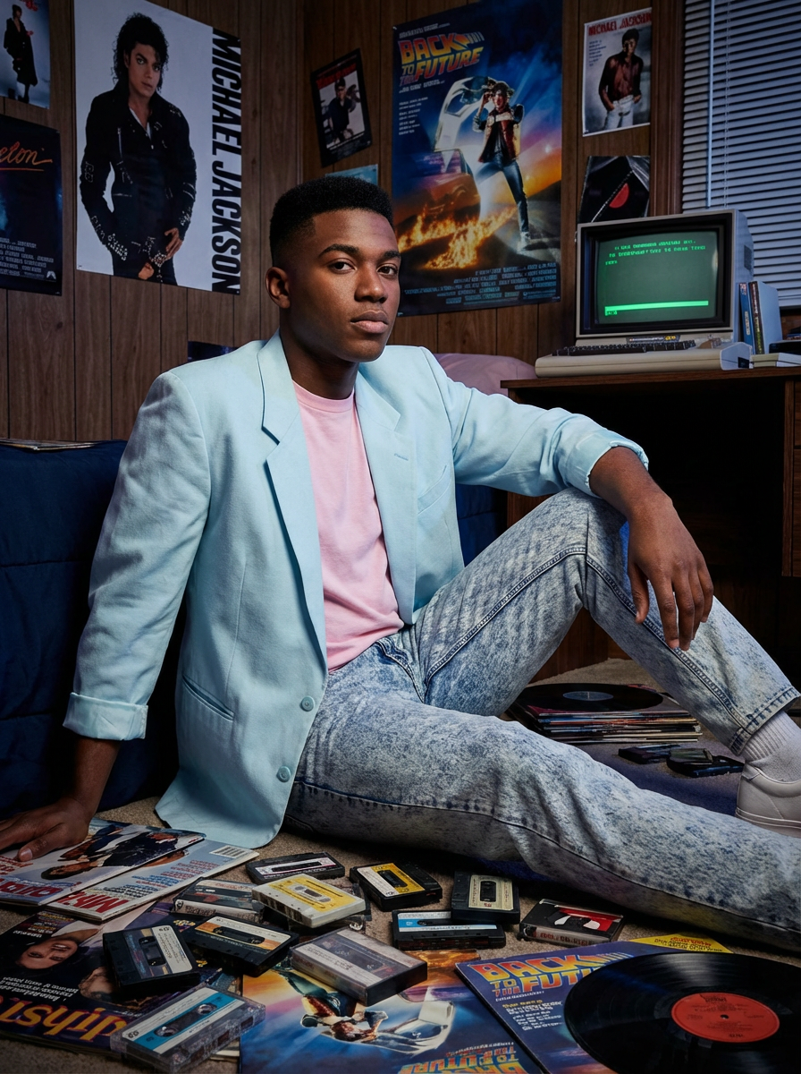 model in a typical 80s bedroom, wearing a Miami Vice style pastel suit jacket with rolled sleeves, surrounded by scattered cassette tapes and vinyl records, posters of 80s bands and movies on the walls, retro computer with green monochrome monitor in background