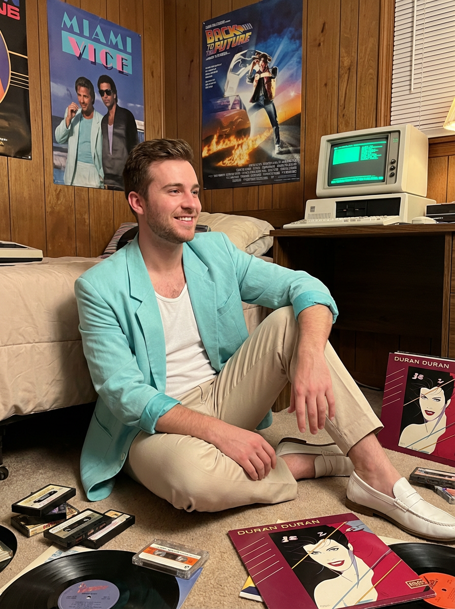 model in a typical 80s bedroom, wearing a Miami Vice style pastel suit jacket with rolled sleeves, surrounded by scattered cassette tapes and vinyl records, posters of 80s bands and movies on the walls, retro computer with green monochrome monitor in background