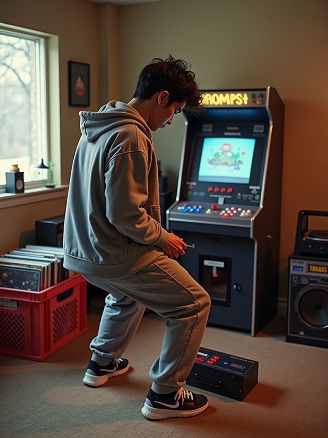 model in a typical 90s rec room, wearing a starter jacket and sweatpants, playing with a Game Boy, boom box playing in background, milk crate full of vinyl records and CDs, retro arcade cabinet visible