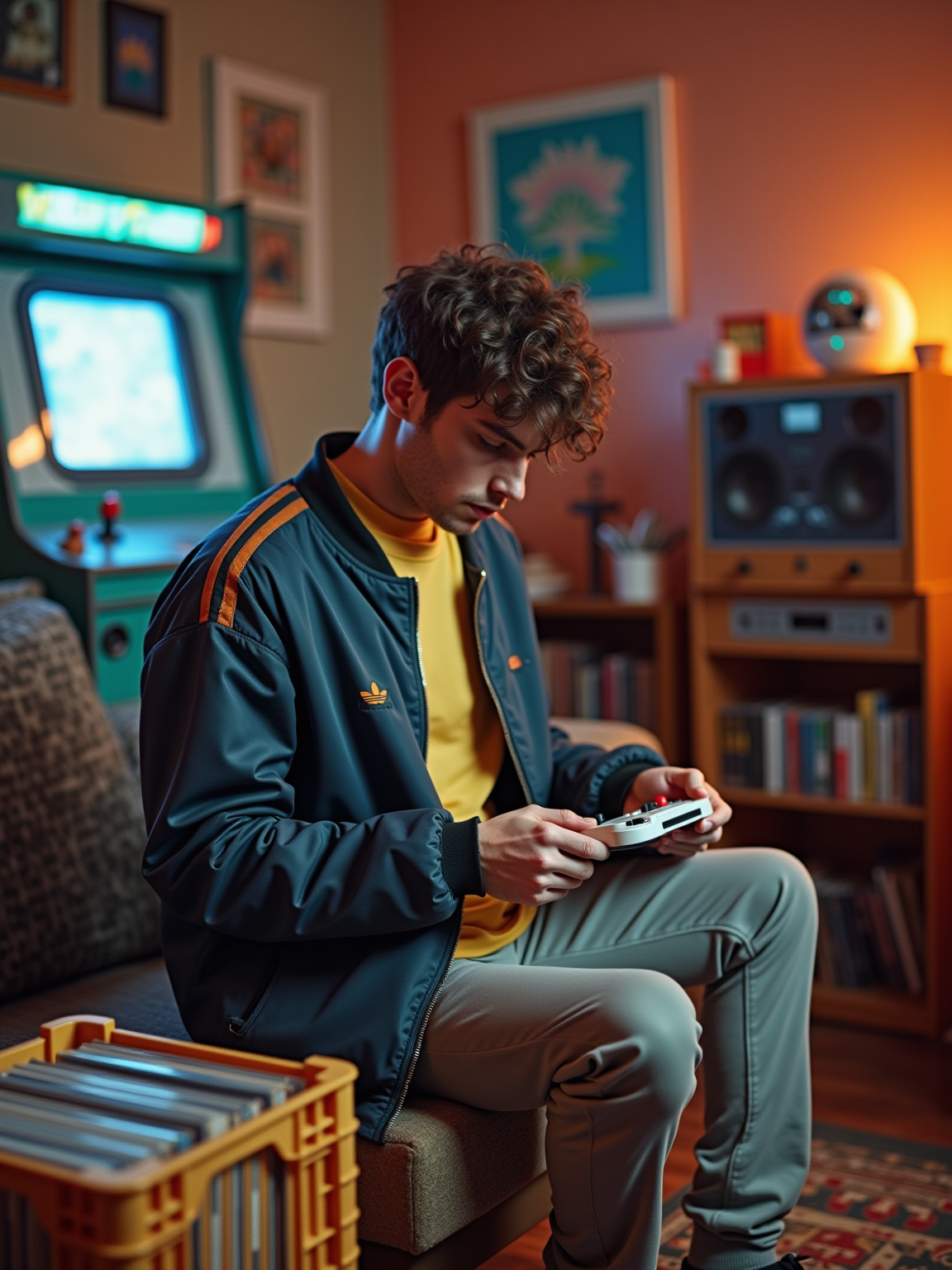 model in a typical 90s rec room, wearing a starter jacket and sweatpants, playing with a Game Boy, boom box playing in background, milk crate full of vinyl records and CDs, retro arcade cabinet visible