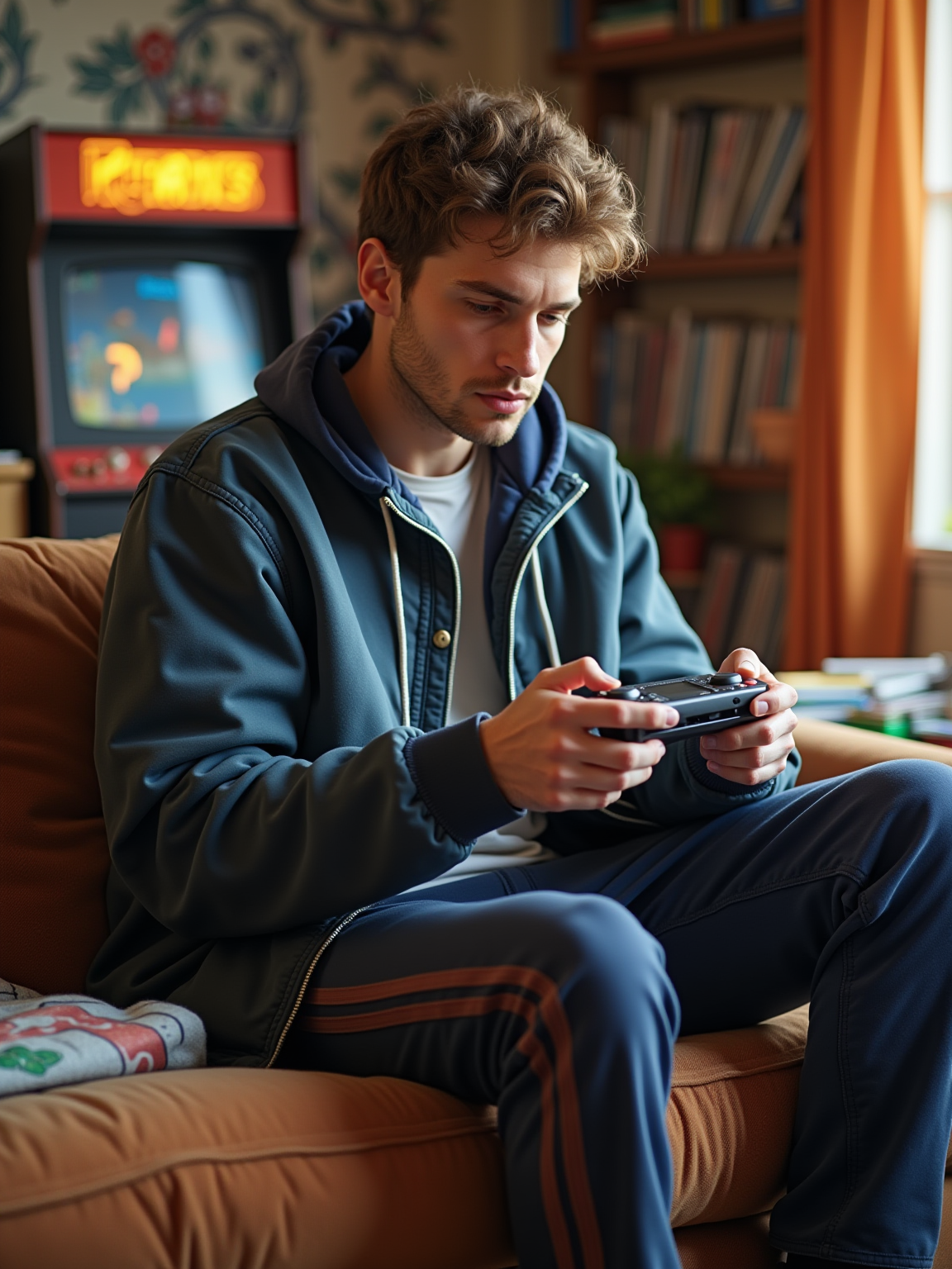 model in a typical 90s rec room, wearing a starter jacket and sweatpants, playing with a Game Boy, boom box playing in background, milk crate full of vinyl records and CDs, retro arcade cabinet visible