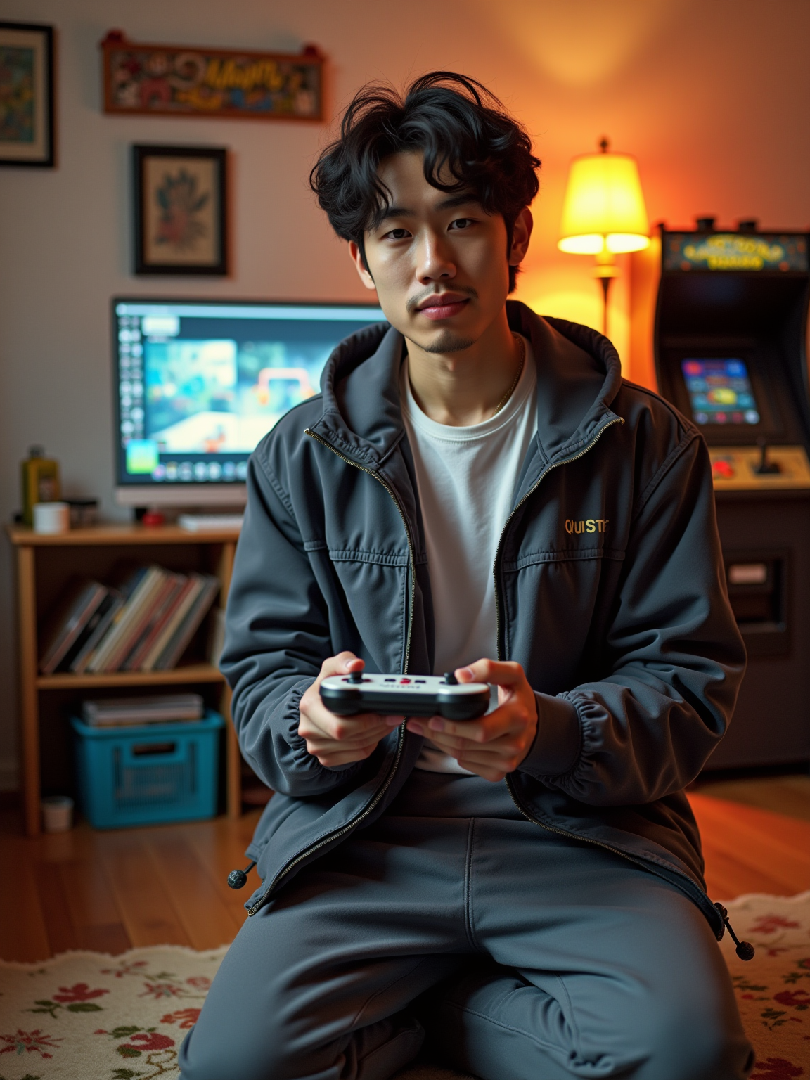 model in a typical 90s rec room, wearing a starter jacket and sweatpants, playing with a Game Boy, boom box playing in background, milk crate full of vinyl records and CDs, retro arcade cabinet visible