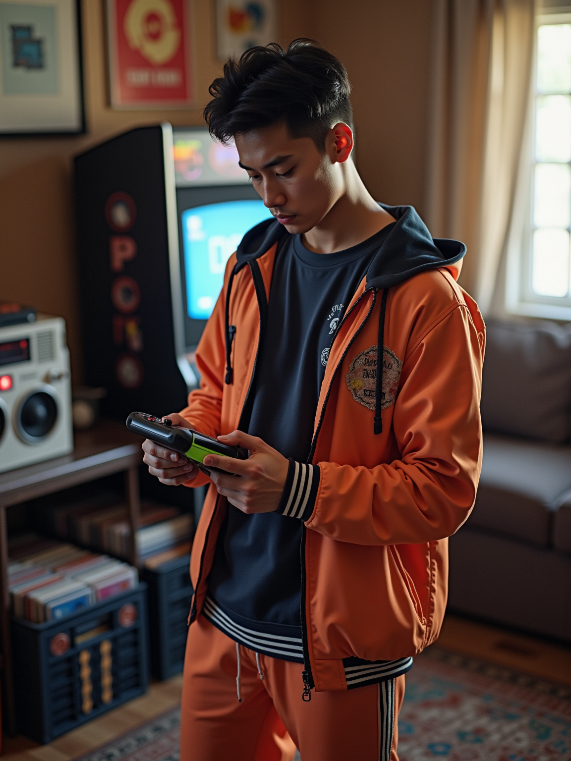 model in a typical 90s rec room, wearing a starter jacket and sweatpants, playing with a Game Boy, boom box playing in background, milk crate full of vinyl records and CDs, retro arcade cabinet visible