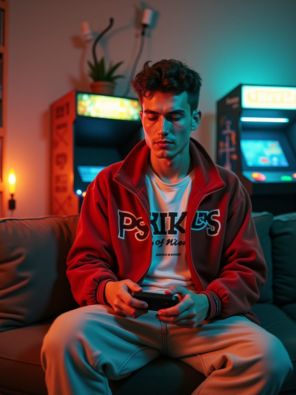model in a typical 90s rec room, wearing a starter jacket and sweatpants, playing with a Game Boy, boom box playing in background, milk crate full of vinyl records and CDs, retro arcade cabinet visible
