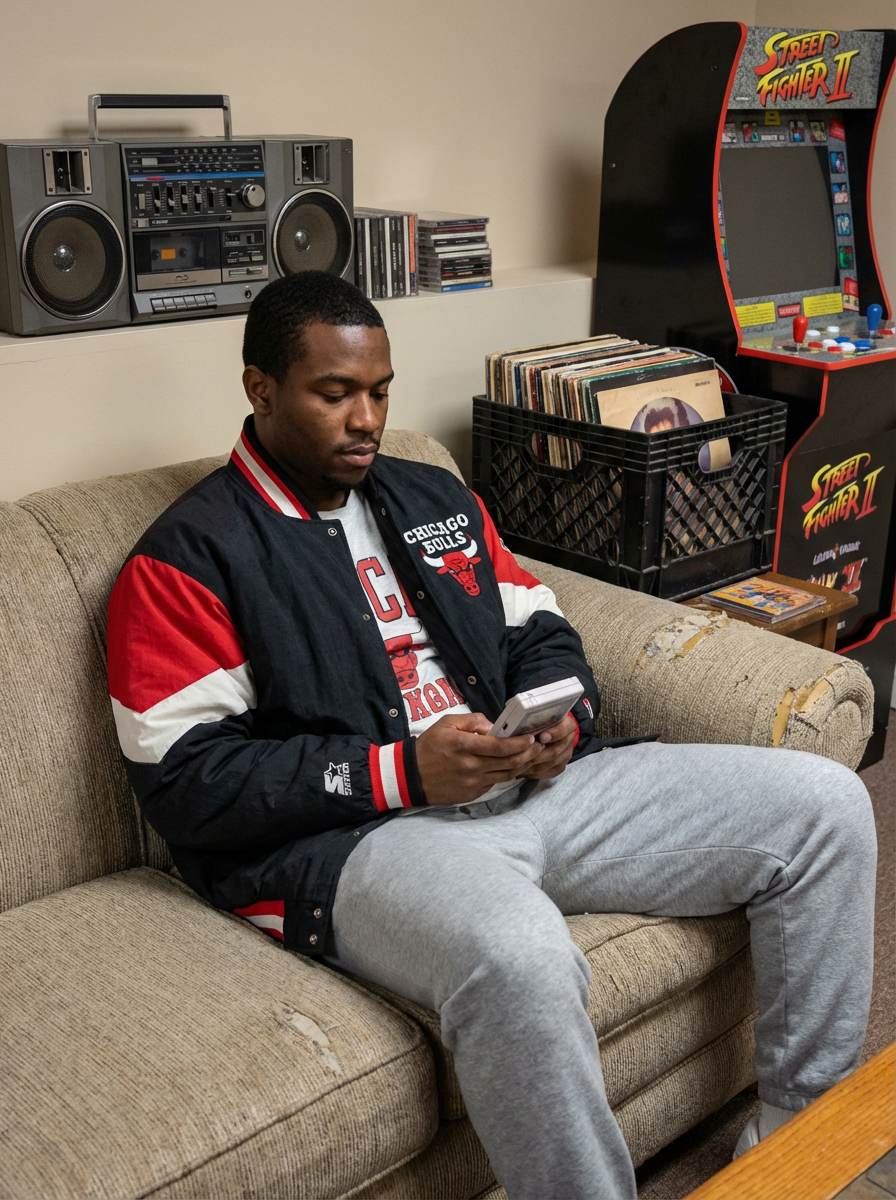 model in a typical 90s rec room, wearing a starter jacket and sweatpants, playing with a Game Boy, boom box playing in background, milk crate full of vinyl records and CDs, retro arcade cabinet visible