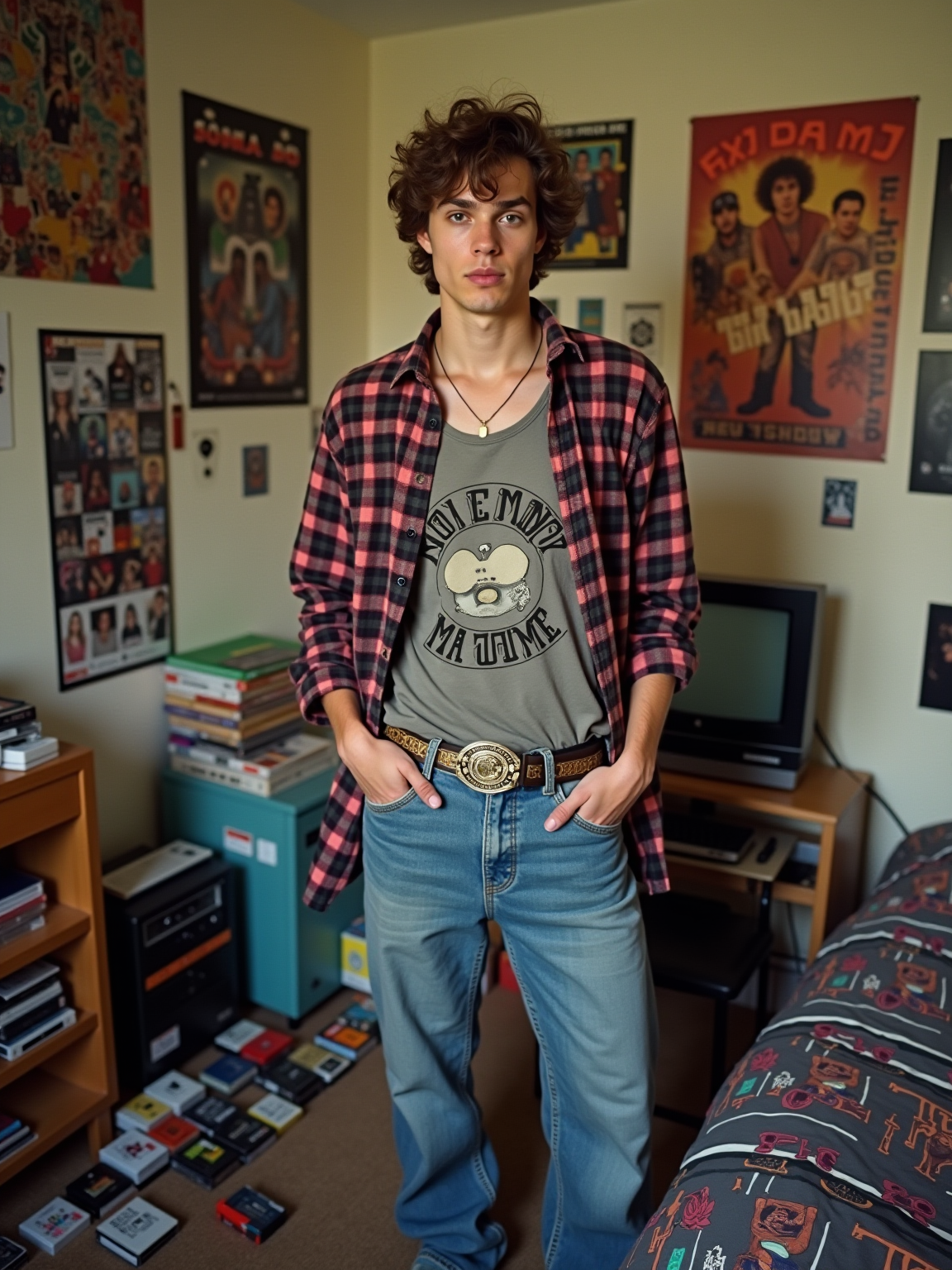 model in a typical 90s teenage bedroom, wearing baggy jeans and a graphic t-shirt with an open flannel, surrounded by scattered cassette tapes and CD cases, posters of 90s bands on the walls, retro computer with CRT monitor in background