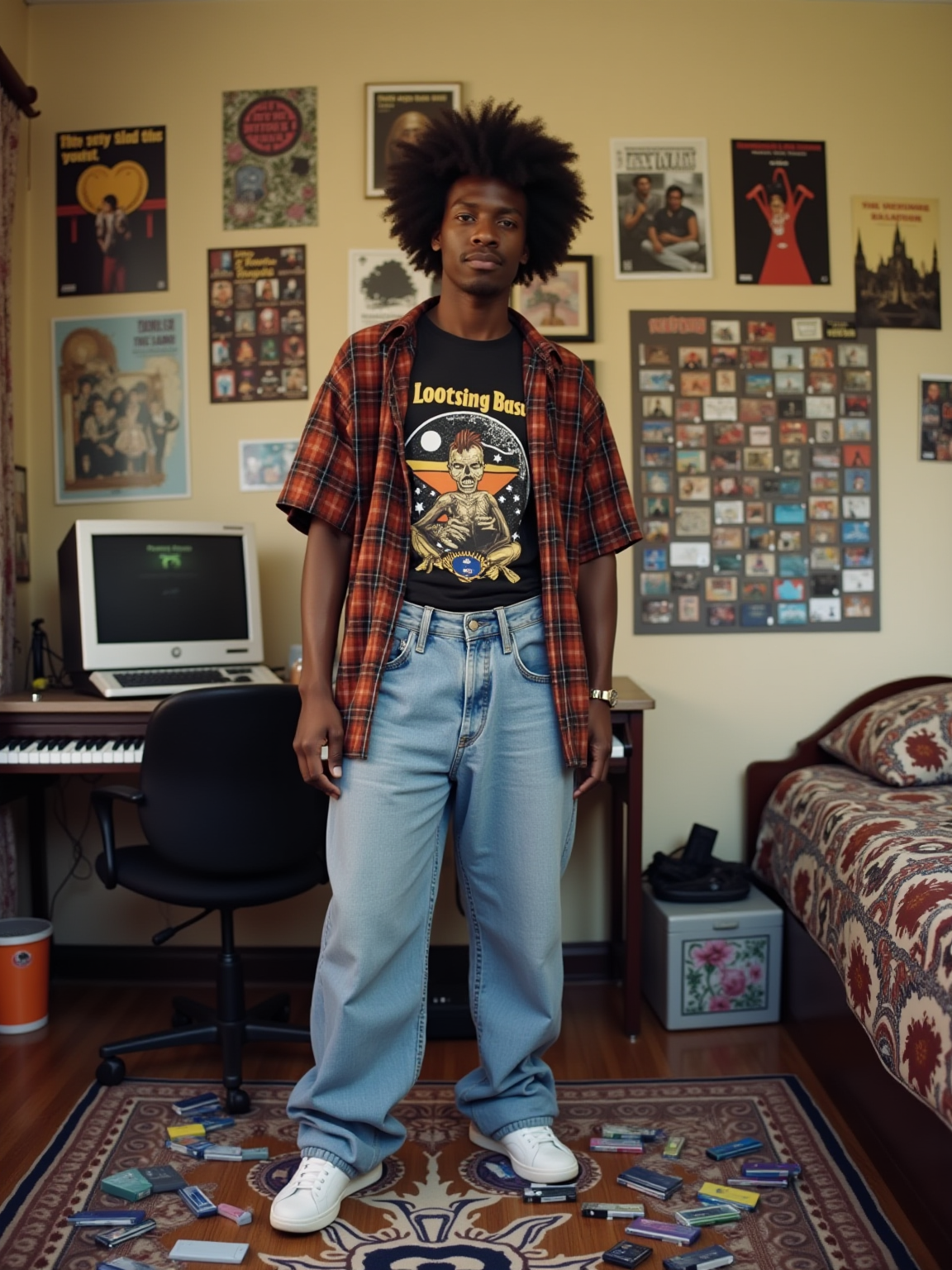 model in a typical 90s teenage bedroom, wearing baggy jeans and a graphic t-shirt with an open flannel, surrounded by scattered cassette tapes and CD cases, posters of 90s bands on the walls, retro computer with CRT monitor in background