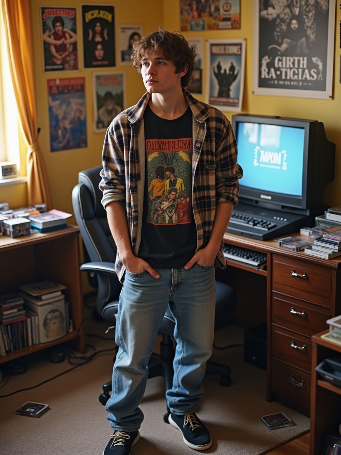 model in a typical 90s teenage bedroom, wearing baggy jeans and a graphic t-shirt with an open flannel, surrounded by scattered cassette tapes and CD cases, posters of 90s bands on the walls, retro computer with CRT monitor in background