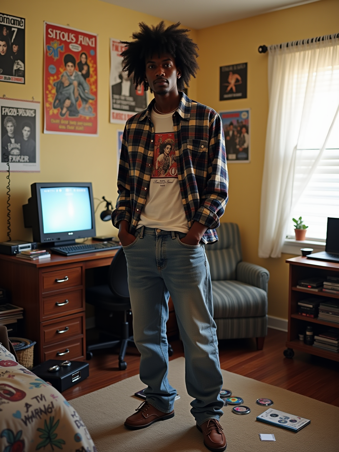 model in a typical 90s teenage bedroom, wearing baggy jeans and a graphic t-shirt with an open flannel, surrounded by scattered cassette tapes and CD cases, posters of 90s bands on the walls, retro computer with CRT monitor in background