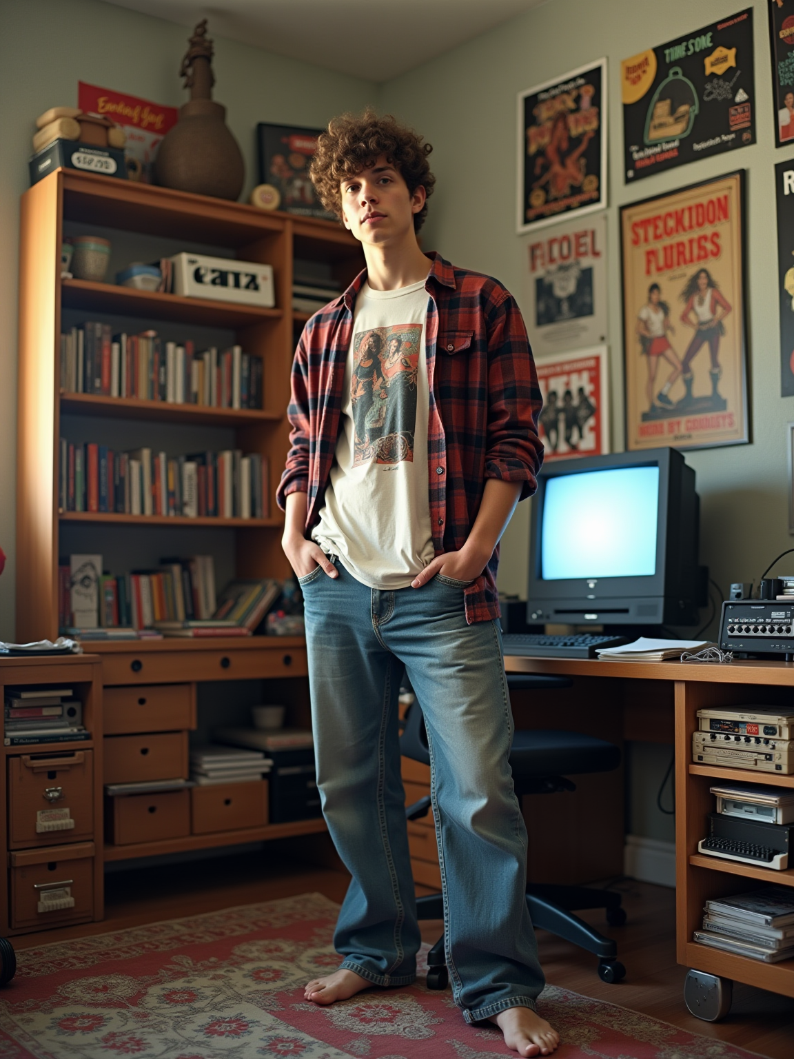 model in a typical 90s teenage bedroom, wearing baggy jeans and a graphic t-shirt with an open flannel, surrounded by scattered cassette tapes and CD cases, posters of 90s bands on the walls, retro computer with CRT monitor in background