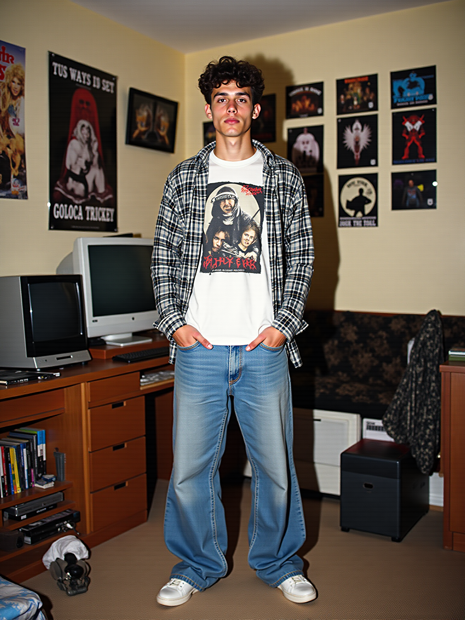model in a typical 90s teenage bedroom, wearing baggy jeans and a graphic t-shirt with an open flannel, surrounded by scattered cassette tapes and CD cases, posters of 90s bands on the walls, retro computer with CRT monitor in background