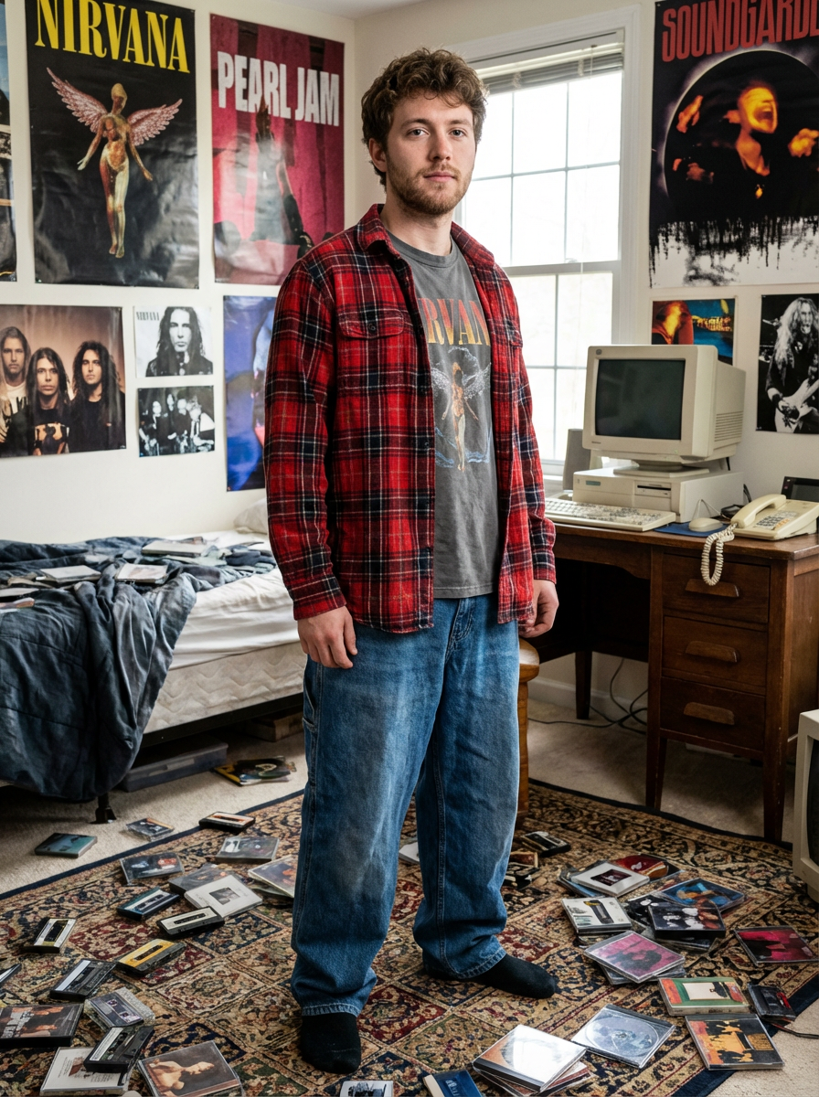 model in a typical 90s teenage bedroom, wearing baggy jeans and a graphic t-shirt with an open flannel, surrounded by scattered cassette tapes and CD cases, posters of 90s bands on the walls, retro computer with CRT monitor in background