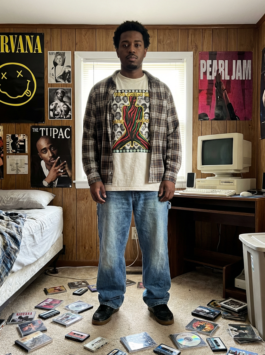 model in a typical 90s teenage bedroom, wearing baggy jeans and a graphic t-shirt with an open flannel, surrounded by scattered cassette tapes and CD cases, posters of 90s bands on the walls, retro computer with CRT monitor in background