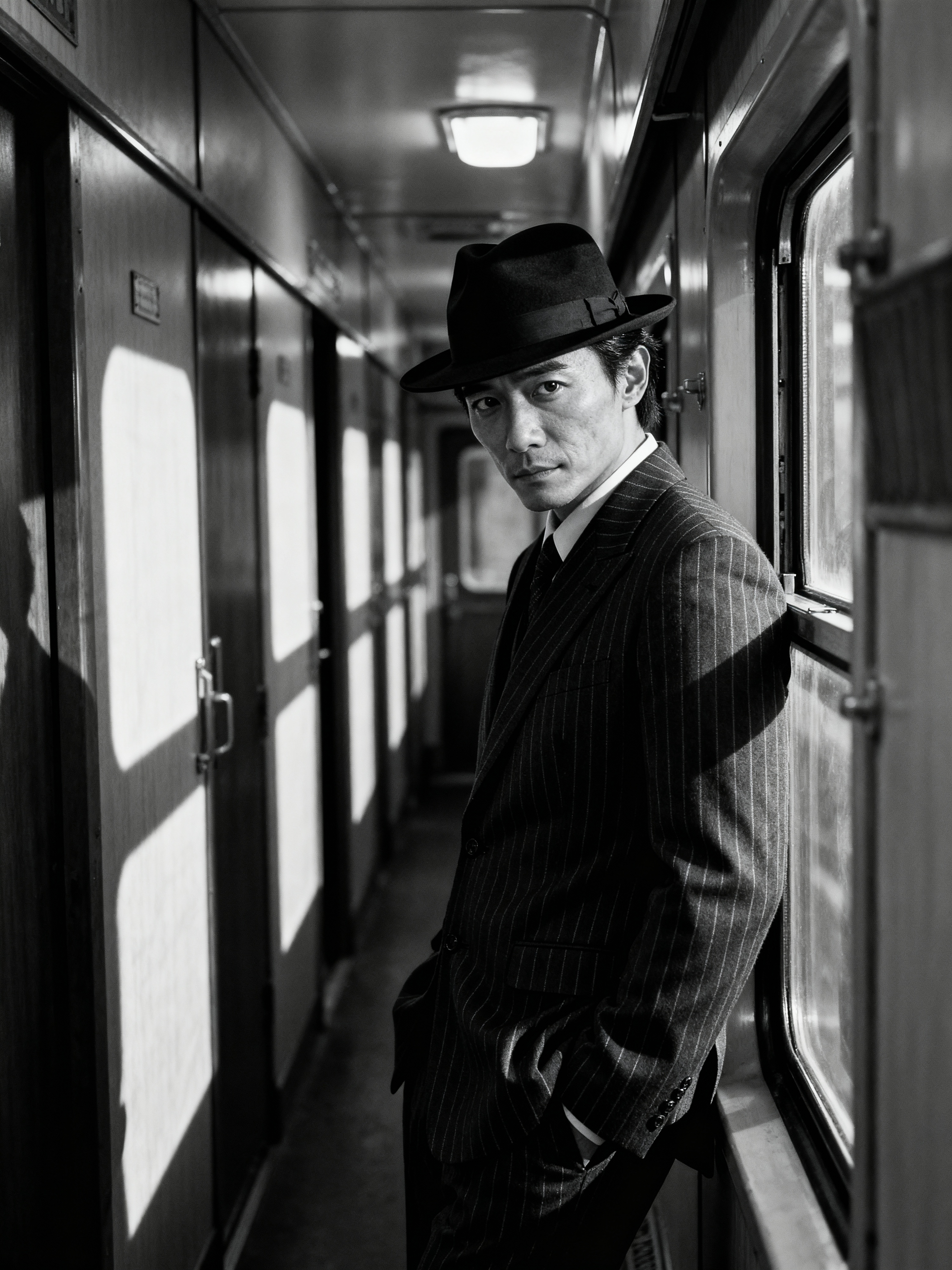 model in a vintage train compartment, wearing a pinstriped suit with fedora, looking pensively out the window, dramatic shadows from passing lights, mysterious atmosphere, high-contrast black and white photography