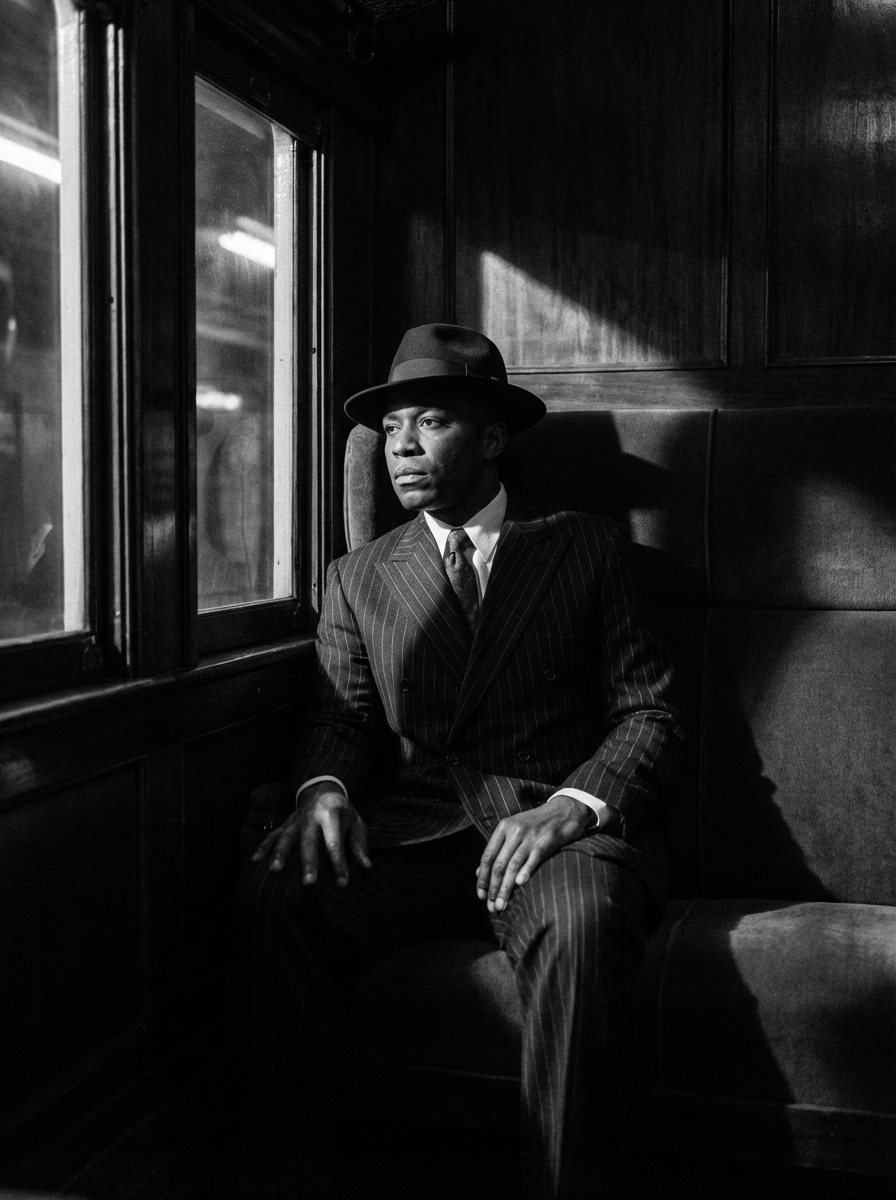 model in a vintage train compartment, wearing a pinstriped suit with fedora, looking pensively out the window, dramatic shadows from passing lights, mysterious atmosphere, high-contrast black and white photography