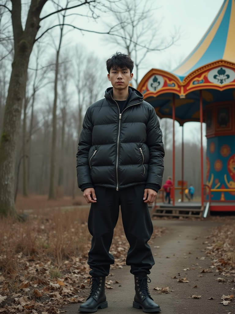model in abandoned overgrown amusement park with amusement rides in Chernobyl. wearing black boots and black pants.