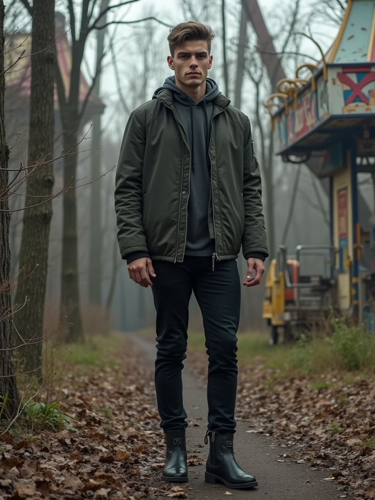 model in abandoned overgrown amusement park with amusement rides in Chernobyl. wearing black boots and black pants.