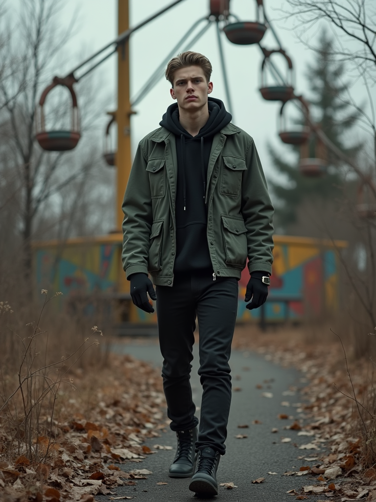 model in abandoned overgrown amusement park with amusement rides in Chernobyl. wearing black boots and black pants.