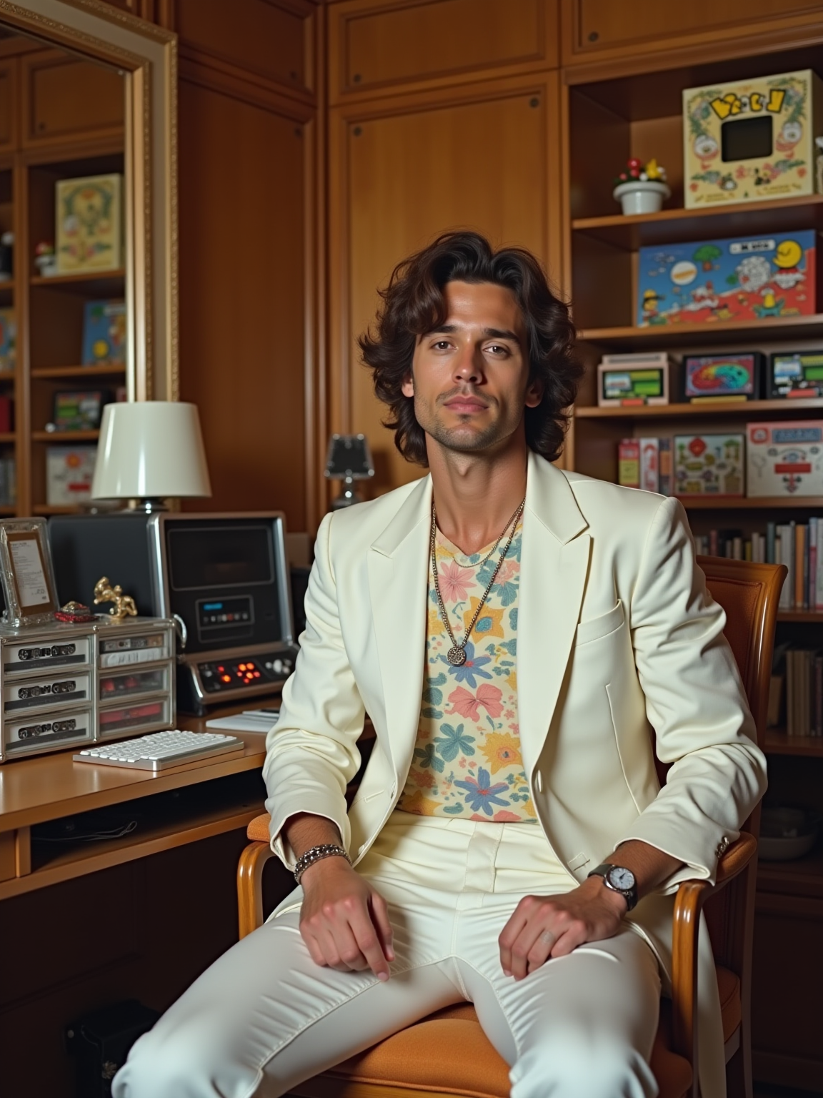 model in an 80s bedroom with wood paneling and mirrored walls, wearing Don Johnson style white suit with pastel t-shirt, sitting at a desk with a clear telephone and answering machine, cassette storage case filled with mixtapes, Pac-model and arcade game memorabilia on shelves
