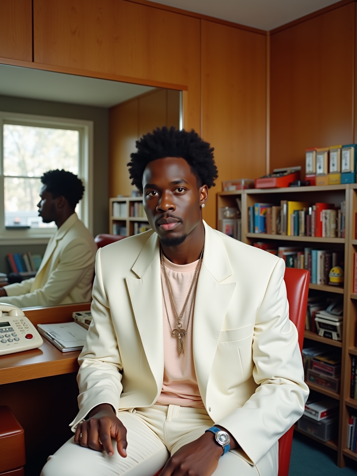 model in an 80s bedroom with wood paneling and mirrored walls, wearing Don Johnson style white suit with pastel t-shirt, sitting at a desk with a clear telephone and answering machine, cassette storage case filled with mixtapes, Pac-model and arcade game memorabilia on shelves