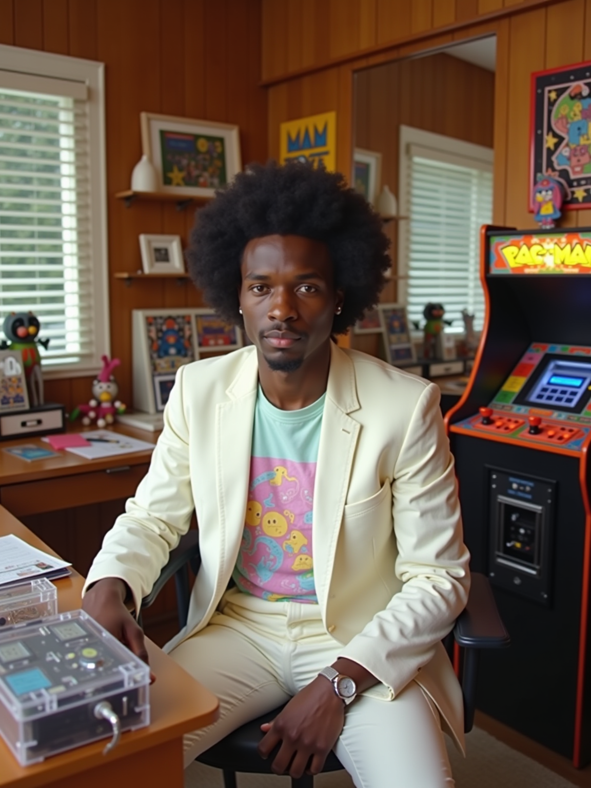 model in an 80s bedroom with wood paneling and mirrored walls, wearing Don Johnson style white suit with pastel t-shirt, sitting at a desk with a clear telephone and answering machine, cassette storage case filled with mixtapes, Pac-model and arcade game memorabilia on shelves