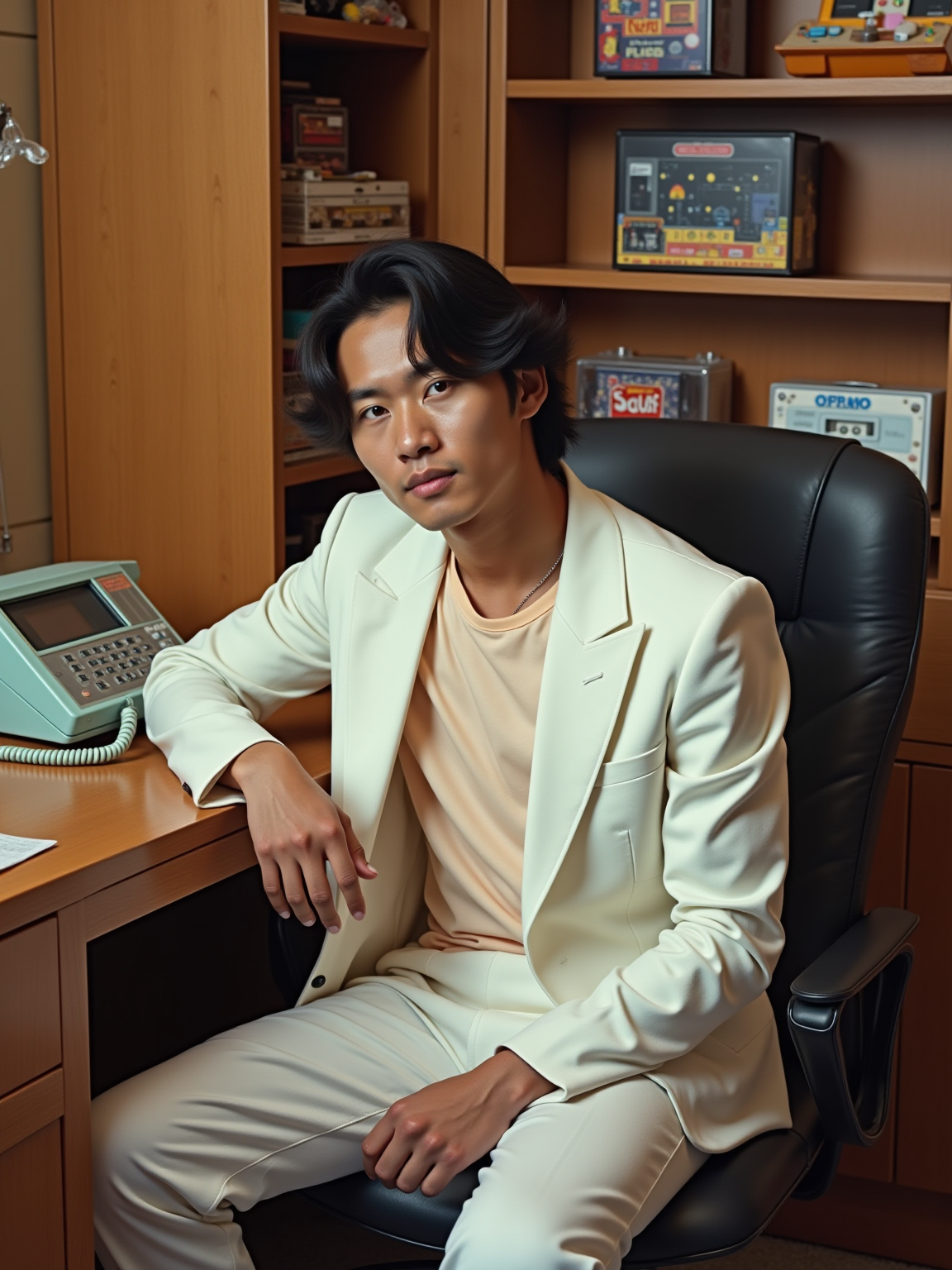 model in an 80s bedroom with wood paneling and mirrored walls, wearing Don Johnson style white suit with pastel t-shirt, sitting at a desk with a clear telephone and answering machine, cassette storage case filled with mixtapes, Pac-model and arcade game memorabilia on shelves