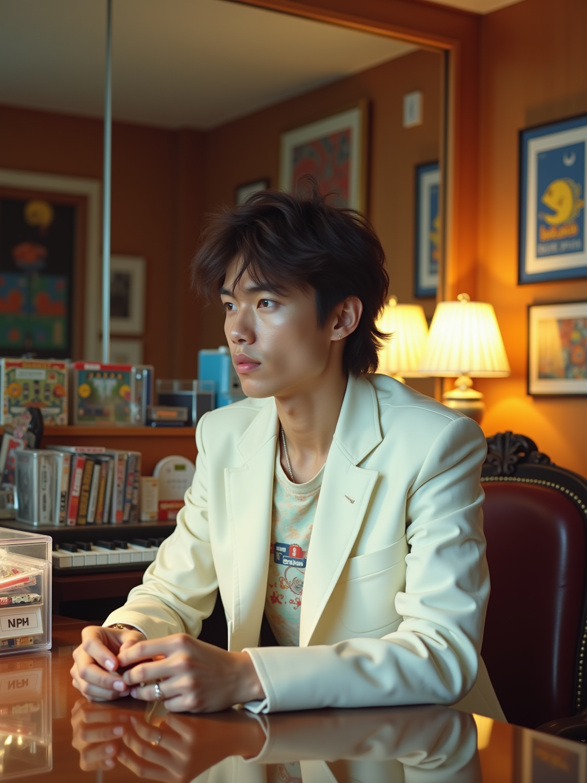 model in an 80s bedroom with wood paneling and mirrored walls, wearing Don Johnson style white suit with pastel t-shirt, sitting at a desk with a clear telephone and answering machine, cassette storage case filled with mixtapes, Pac-model and arcade game memorabilia on shelves
