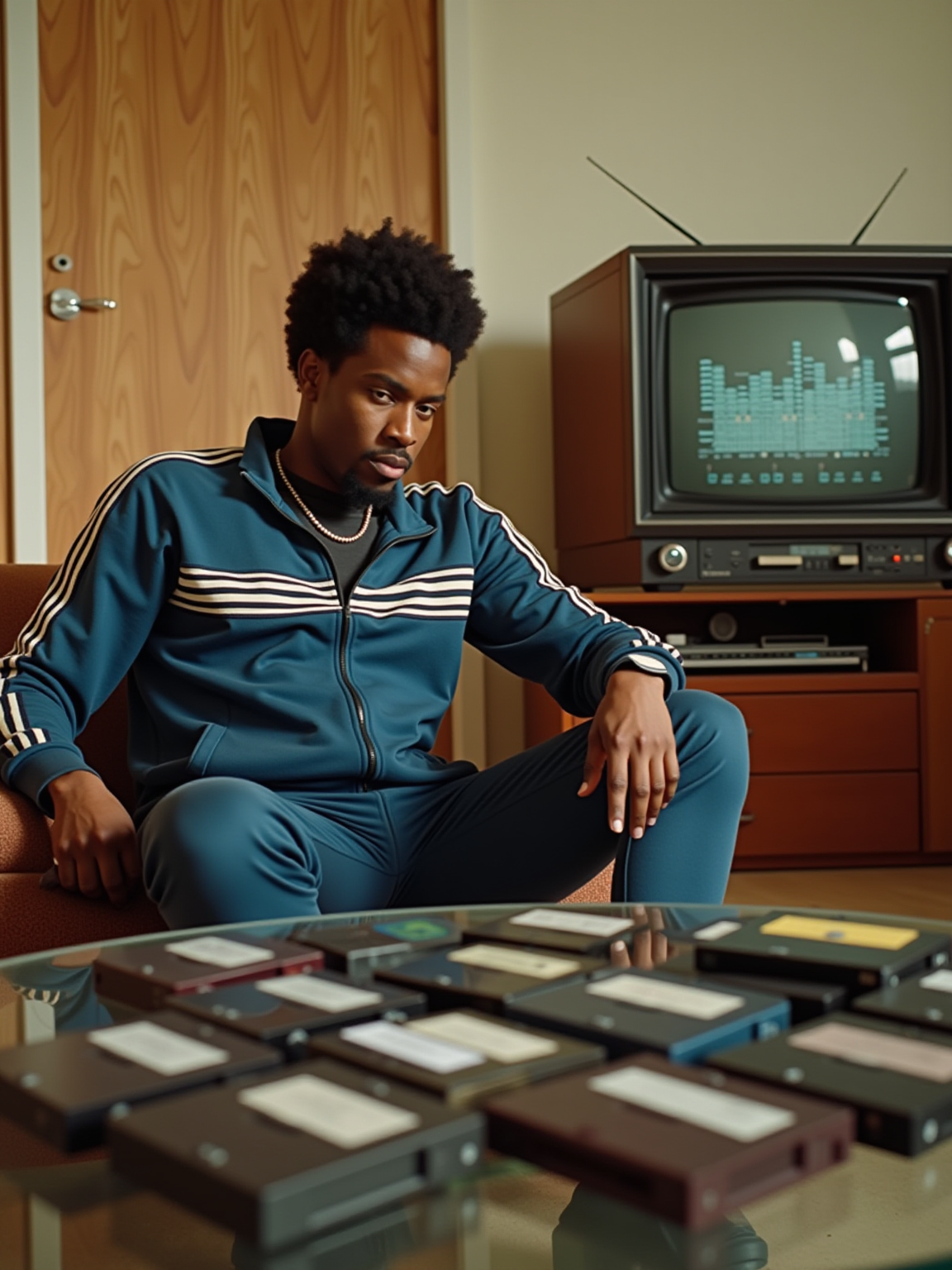 model in an 80s living room, wearing tracksuit with racing stripes, sitting next to a large boombox with equalizer display, collection of VHS tapes spread on a glass coffee table, wood-grain TV with rabbit ears antenna