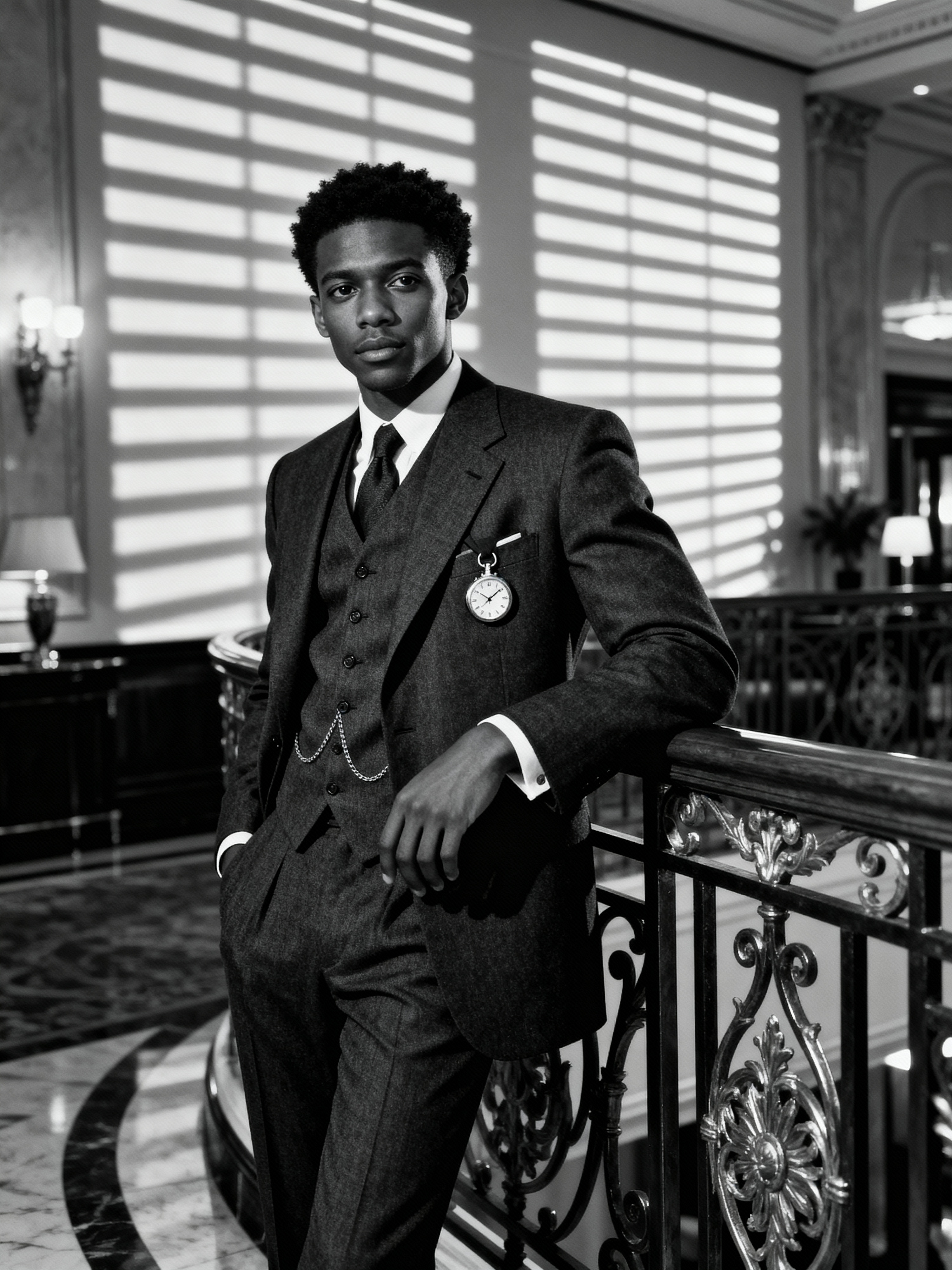 model in an elegant vintage hotel lobby, wearing a three-piece suit with pocket watch, leaning against ornate railing, dramatic venetian blinds casting striped shadows, black and white photography with deep shadows
