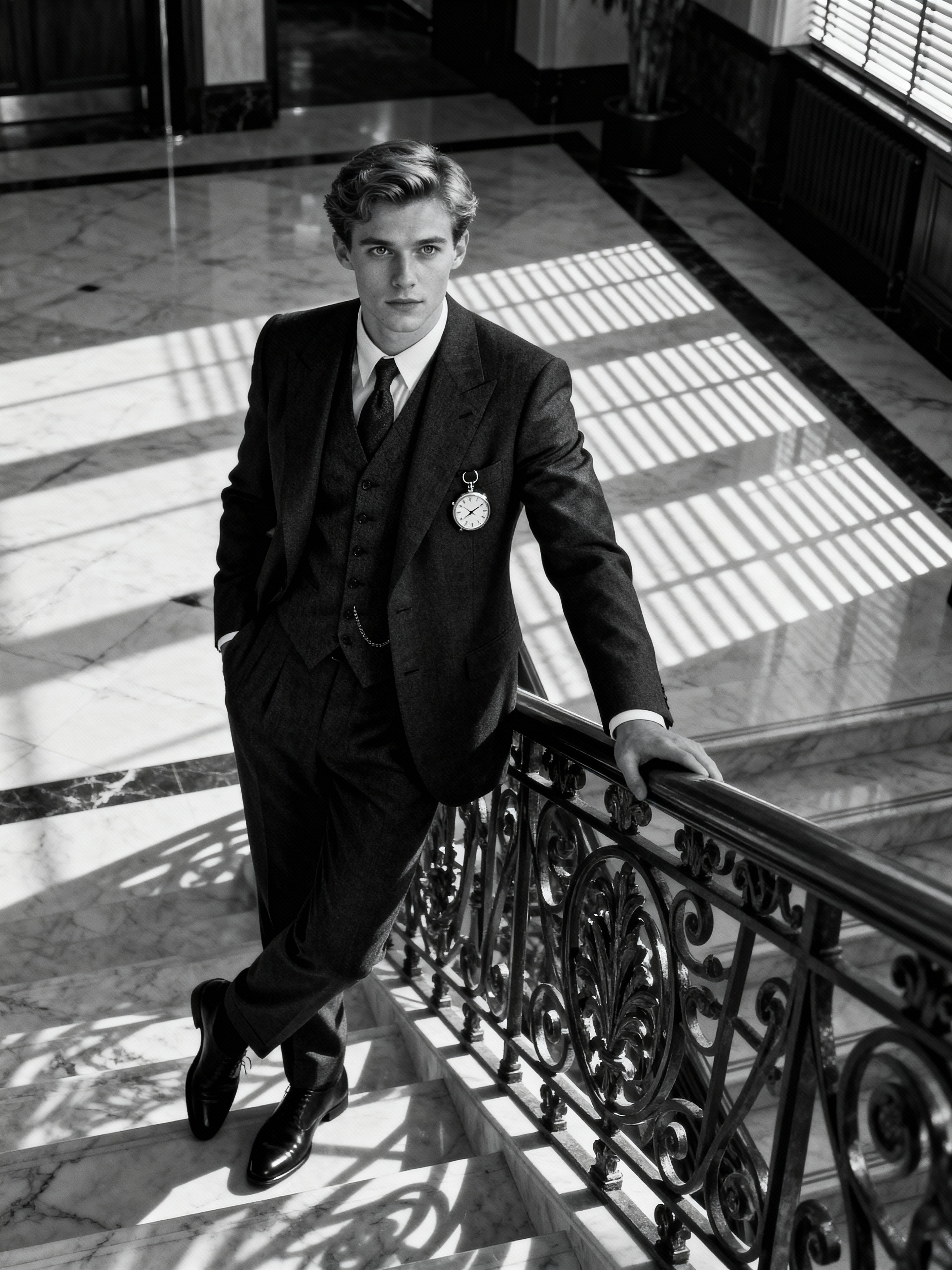 model in an elegant vintage hotel lobby, wearing a three-piece suit with pocket watch, leaning against ornate railing, dramatic venetian blinds casting striped shadows, black and white photography with deep shadows