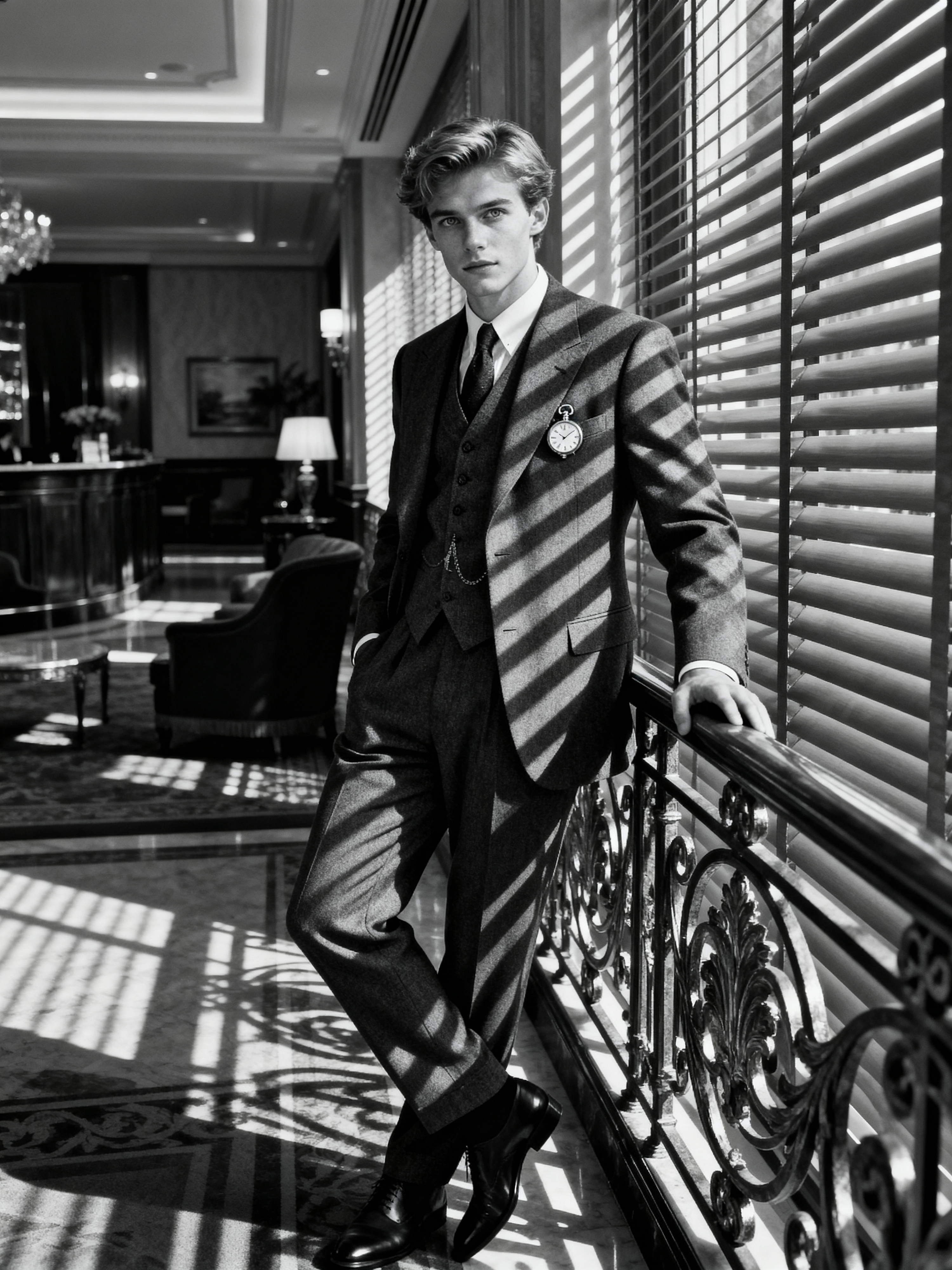 model in an elegant vintage hotel lobby, wearing a three-piece suit with pocket watch, leaning against ornate railing, dramatic venetian blinds casting striped shadows, black and white photography with deep shadows