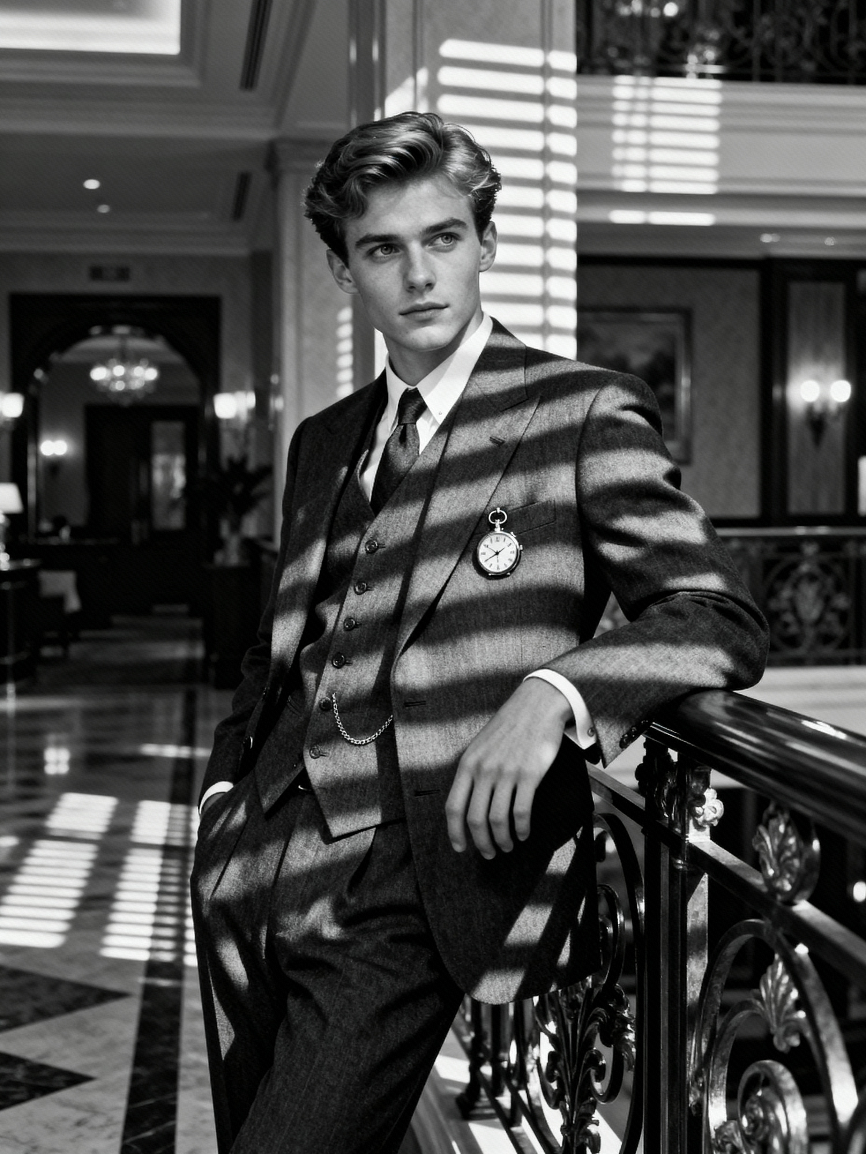 model in an elegant vintage hotel lobby, wearing a three-piece suit with pocket watch, leaning against ornate railing, dramatic venetian blinds casting striped shadows, black and white photography with deep shadows