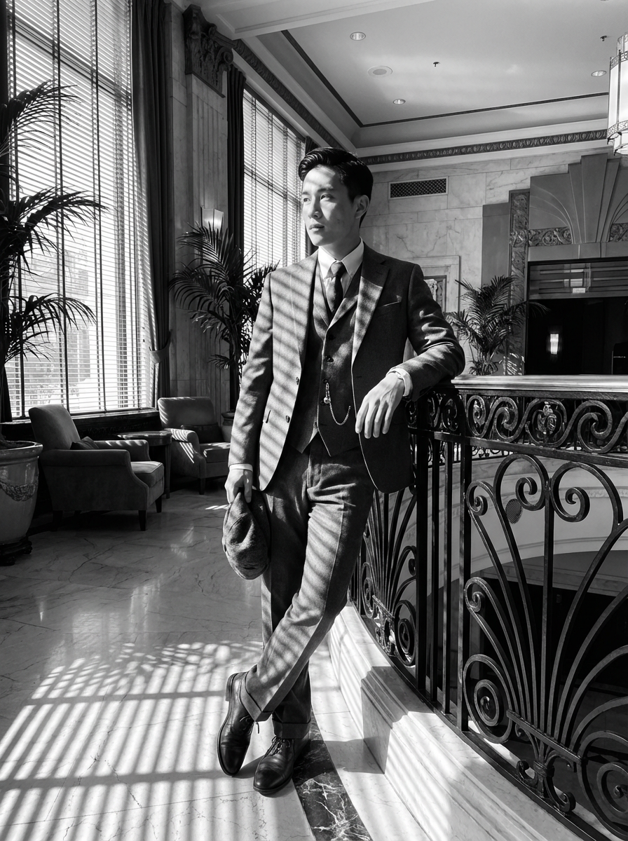 model in an elegant vintage hotel lobby, wearing a three-piece suit with pocket watch, leaning against ornate railing, dramatic venetian blinds casting striped shadows, black and white photography with deep shadows