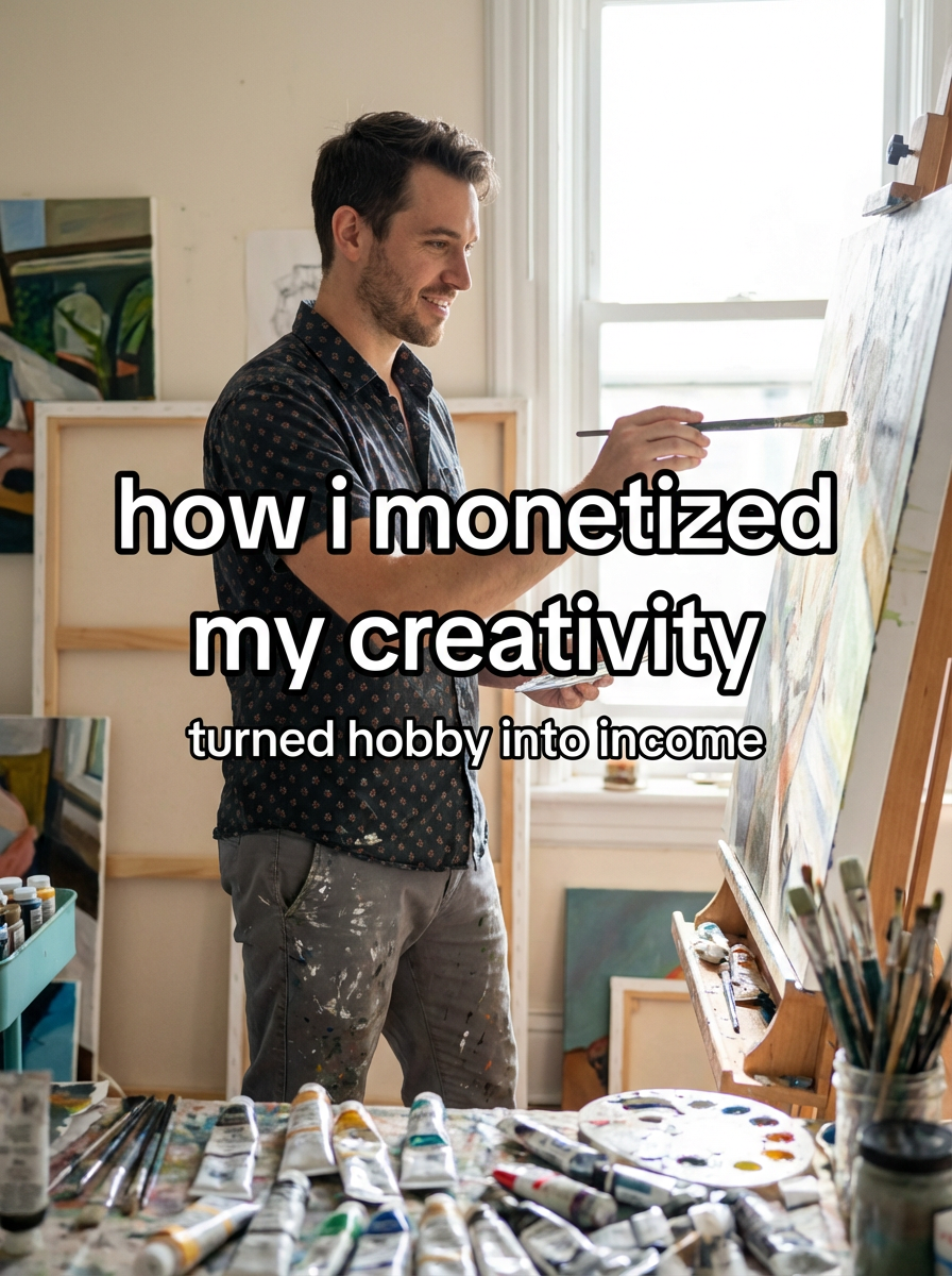 model in artistic casual wear in art studio or creative space, working on project, inspiring lighting, creative chaos. TikTok-style text overlay with white text with black outline: "how i monetized my creativity" smaller text: "(turned hobby into income)", do not show tiktok interface or logo