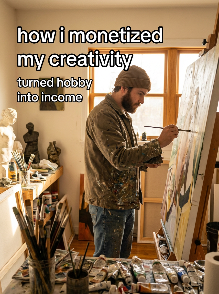 model in artistic casual wear in art studio or creative space, working on project, inspiring lighting, creative chaos. TikTok-style text overlay with white text with black outline: "how i monetized my creativity" smaller text: "(turned hobby into income)", do not show tiktok interface or logo
