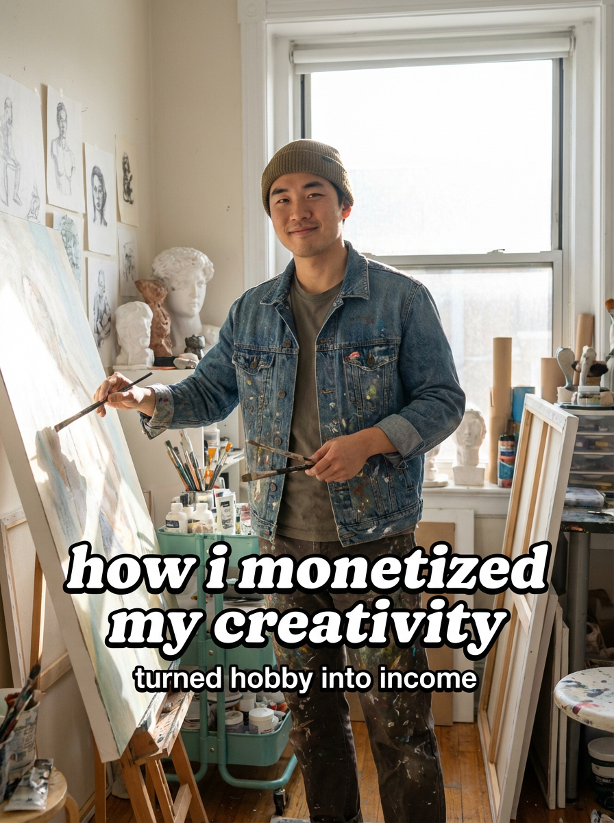 model in artistic casual wear in art studio or creative space, working on project, inspiring lighting, creative chaos. TikTok-style text overlay with white text with black outline: "how i monetized my creativity" smaller text: "(turned hobby into income)", do not show tiktok interface or logo