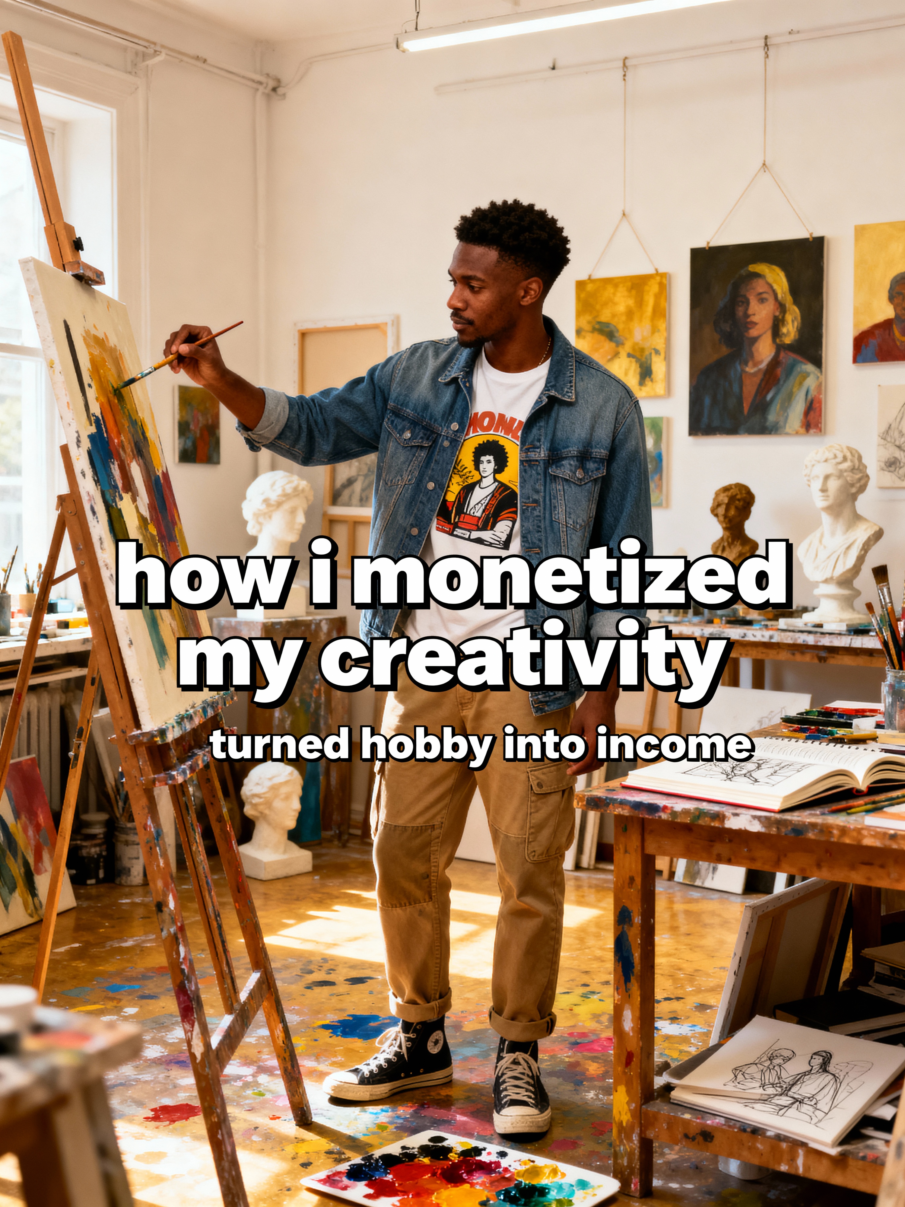 model in artistic casual wear in art studio or creative space, working on project, inspiring lighting, creative chaos. instagram-style text overlay with white text with black outline: "how i monetized my creativity" smaller text: "(turned hobby into income)", do not show instagram interface or logo