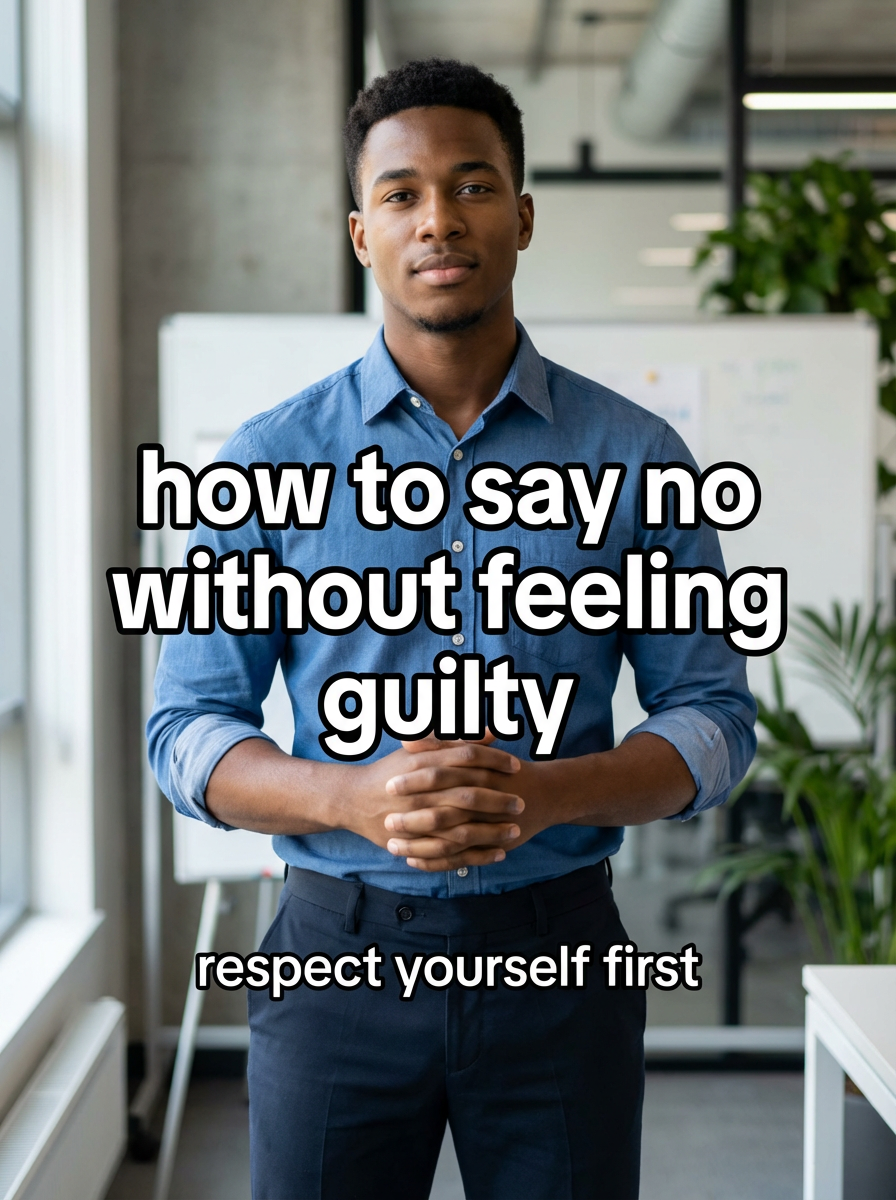 model in assertiveness training attire in professional or personal setting, confident posture, empowering lighting. TikTok-style text overlay with white text with black outline: "how to say no without feeling guilty" smaller text: "(respect yourself first)", do not show tiktok interface or logo