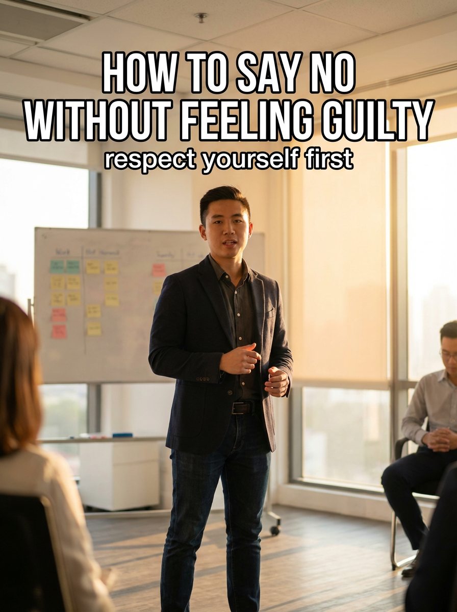 model in assertiveness training attire in professional or personal setting, confident posture, empowering lighting. TikTok-style text overlay with white text with black outline: "how to say no without feeling guilty" smaller text: "(respect yourself first)", do not show tiktok interface or logo
